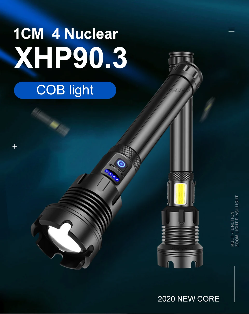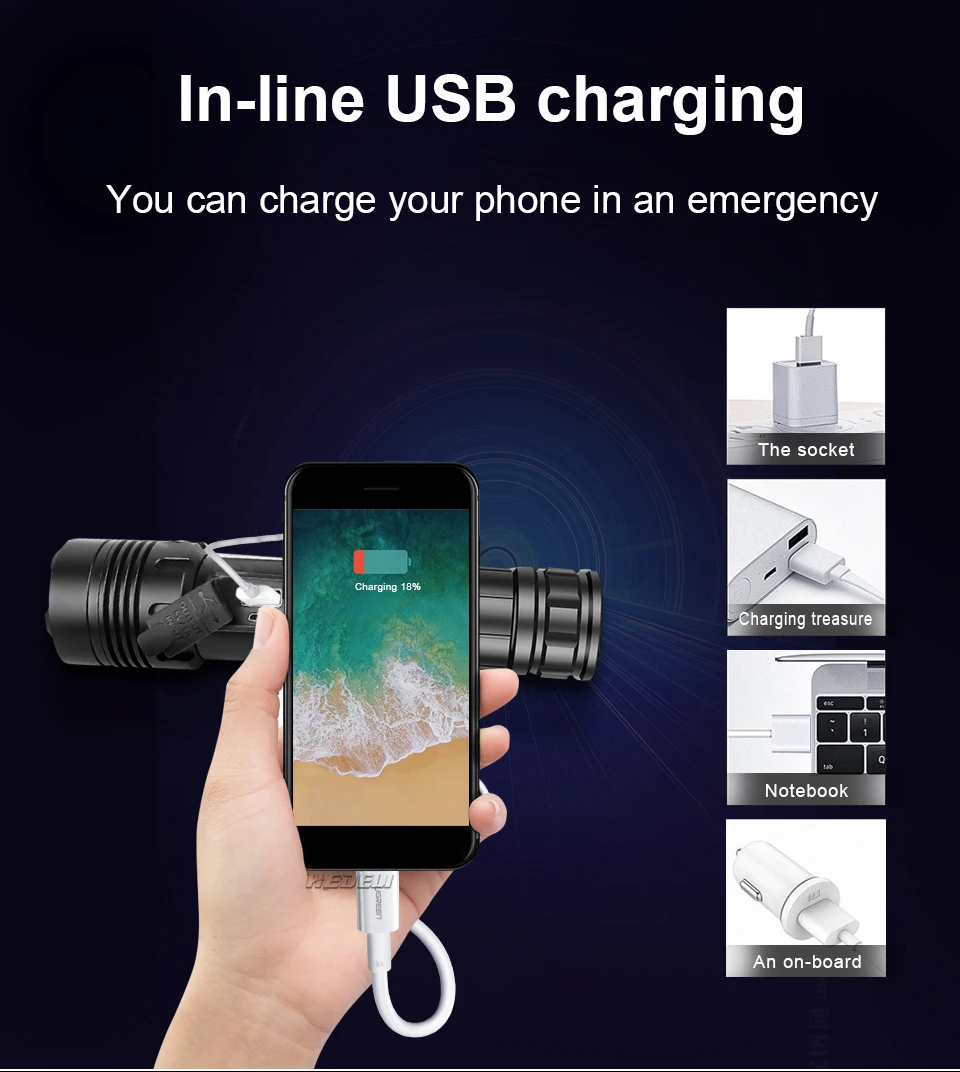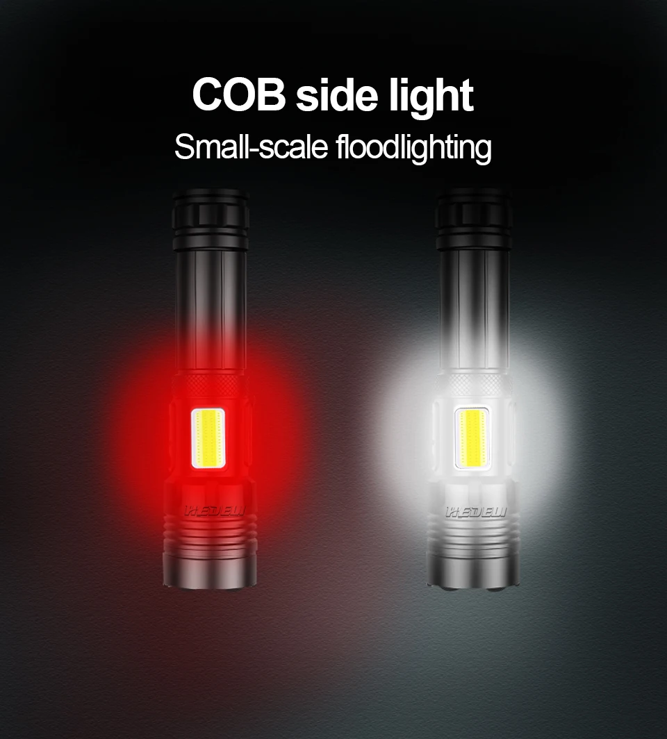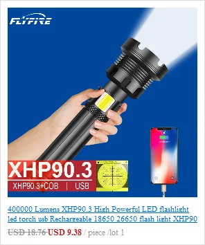 Сильный светильник вспышки светильник использует XHP70.2 светодиодный + с использованием бескорпусного чипа (, который может использоваться в качестве флеш-светильник или рабочий светильник, при этом максимальная яркость 300000 люмен и облучения расстояние 800 метровТелескопический зум; Яркий на больших расстояниях, более четко на близком расстоянии3 режима: высокая, низкая, вспышка (простота использования в различных сценариях)Двойной щелчок, чтобы переключить режим COB, белый светильник COB, подходящий для работы/кемпинга/активного отдыха, красный светильник, аварийный сигнал, Длительное нажатие на любую позицию, чтобы выключить флэш-светильникИспользуйте перезаряжаемый аккумулятор 1*18650 или 1*26650, время работы 26650 большеПортативный микро USB вход, подходит для автомобиля/мобильного питания/компьютера/USB разъемВыход USB (5 в 1 а) может использоваться как Мобильная мощность4 уровня отображения мощности (1% ~ 25%, 25 ~ 50%, 50% ~ 75%, 75% ~ 100%)Водонепроницаемый класс соответствует IPX-6, водонепроницаемость, может использоваться в дождливые дни, но не может быть помещен в водуИзготовлен из авиационного алюминиевого сплава, прочный HAIII военный Жесткий анодированныйПодходит для работы, охоты, альпинизма, рыбалки, кемпинга и активного отдыха и т. д.
