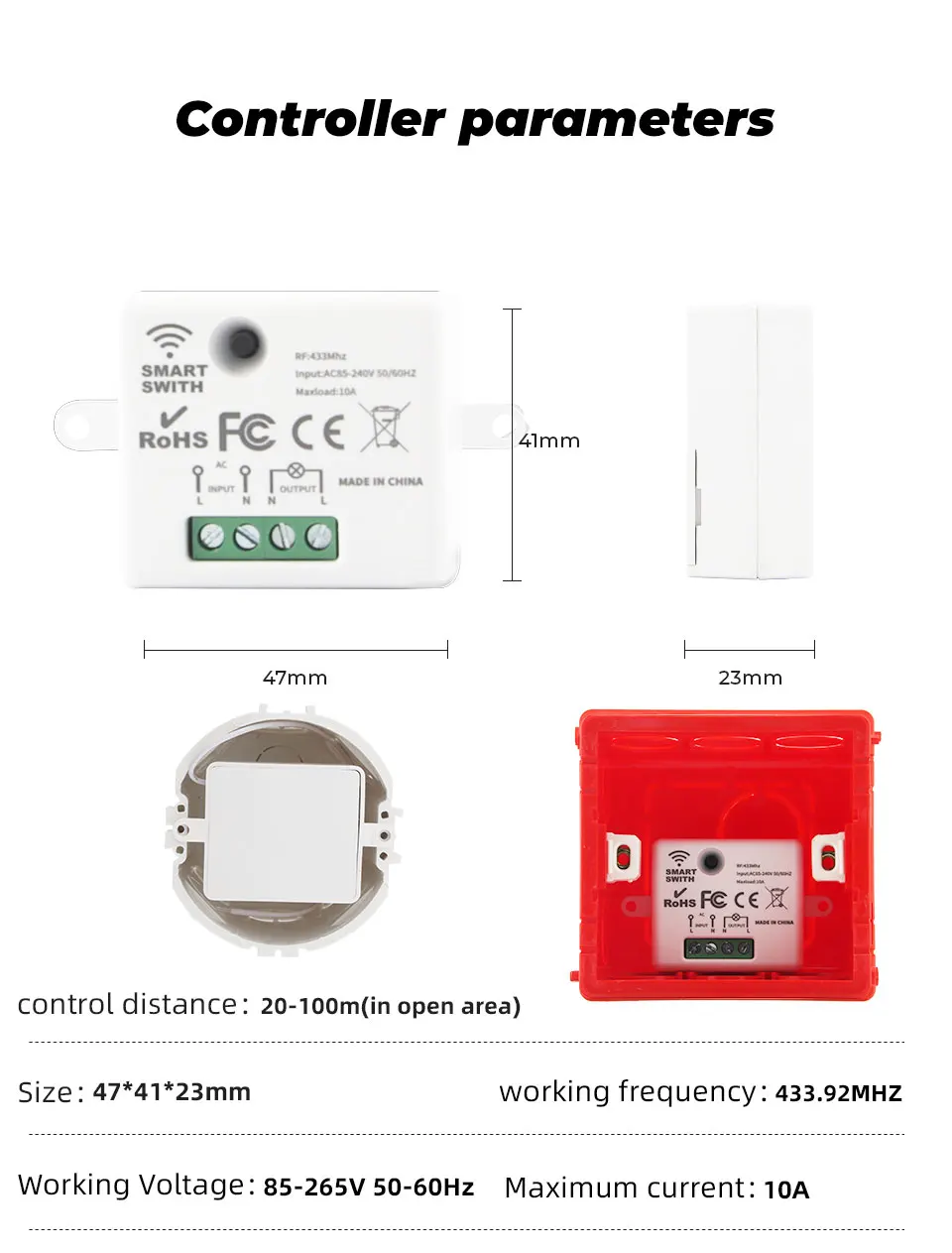 Расстояние управления: 20-100 м Рабочая частота: 433,92 МГц Рабочее напряжение: 85-265 в 50-60 Гц Максимальный ток: 10A Размер: 47*41*23 мм