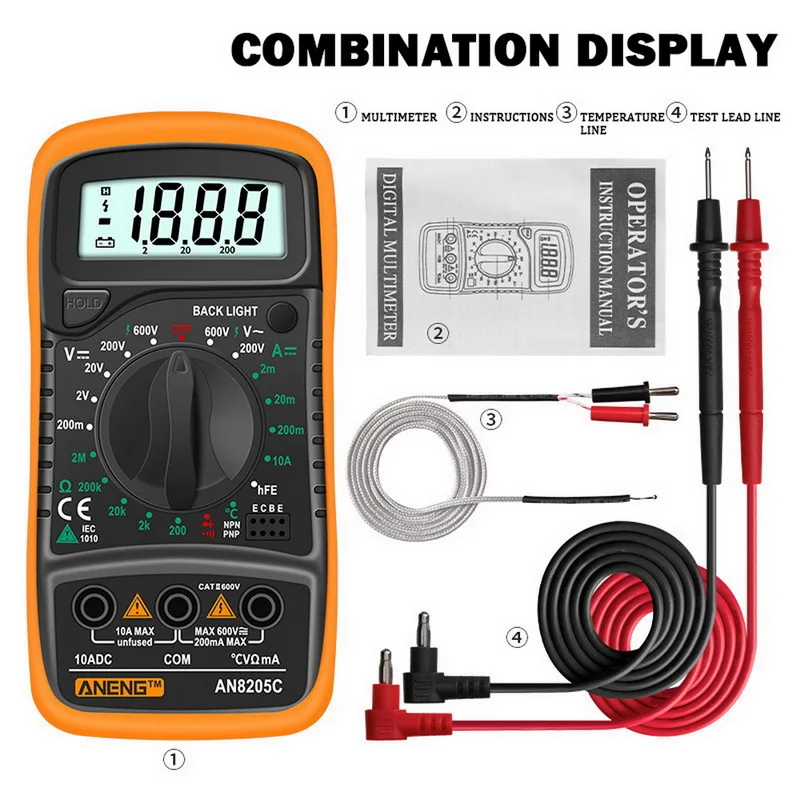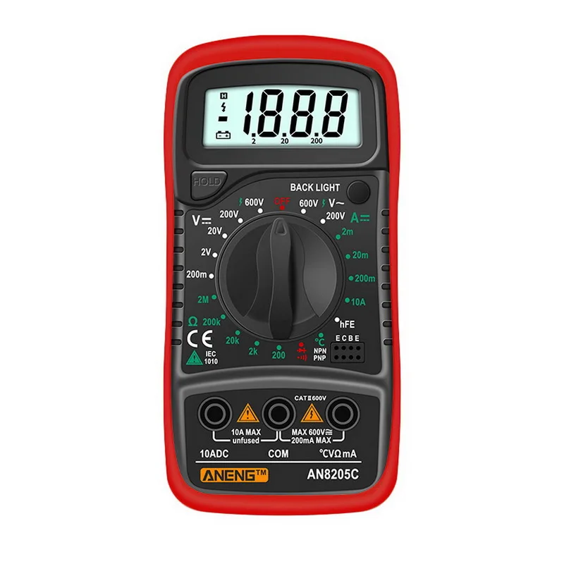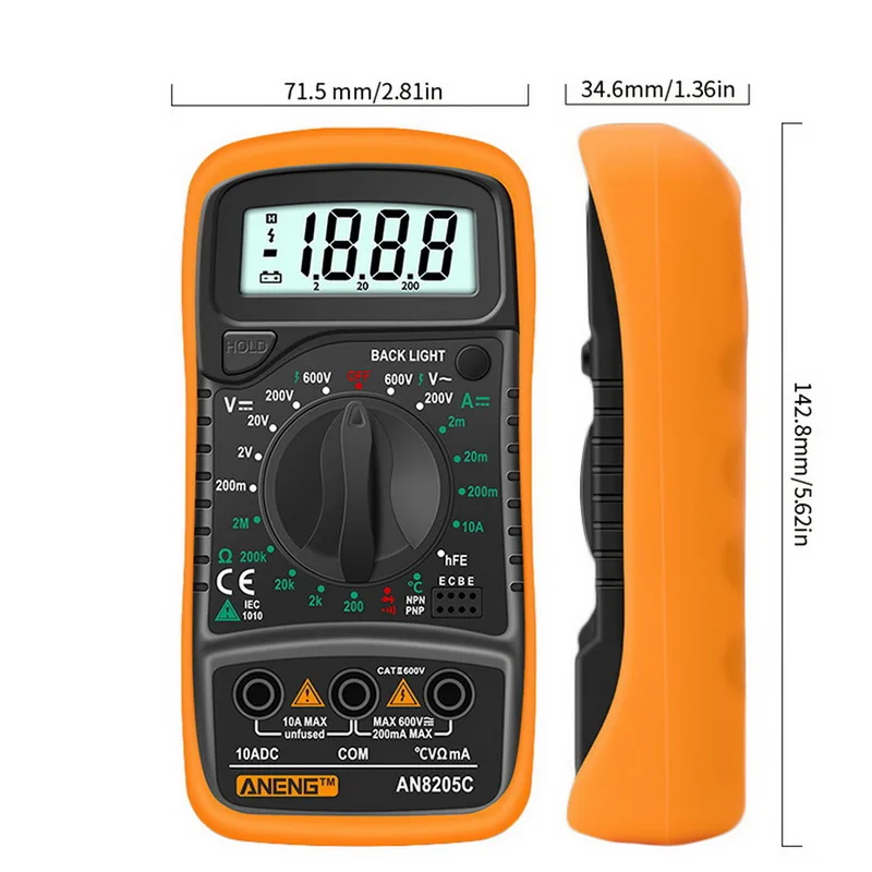 ** Многофункциональность: Широкий диапазон испытаний для переменного/постоянного напряжения, постоянного тока, сопротивления, зуммера, тестовых диодов, hFE и температуры.