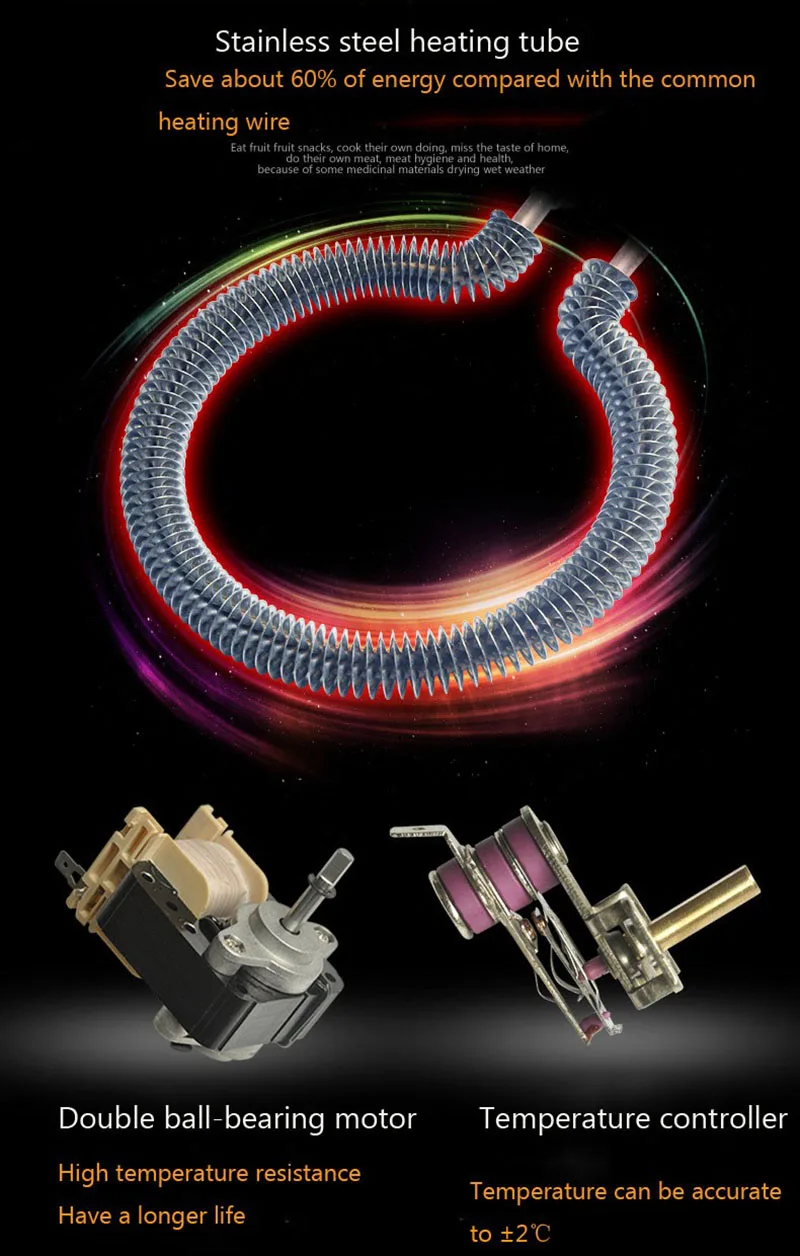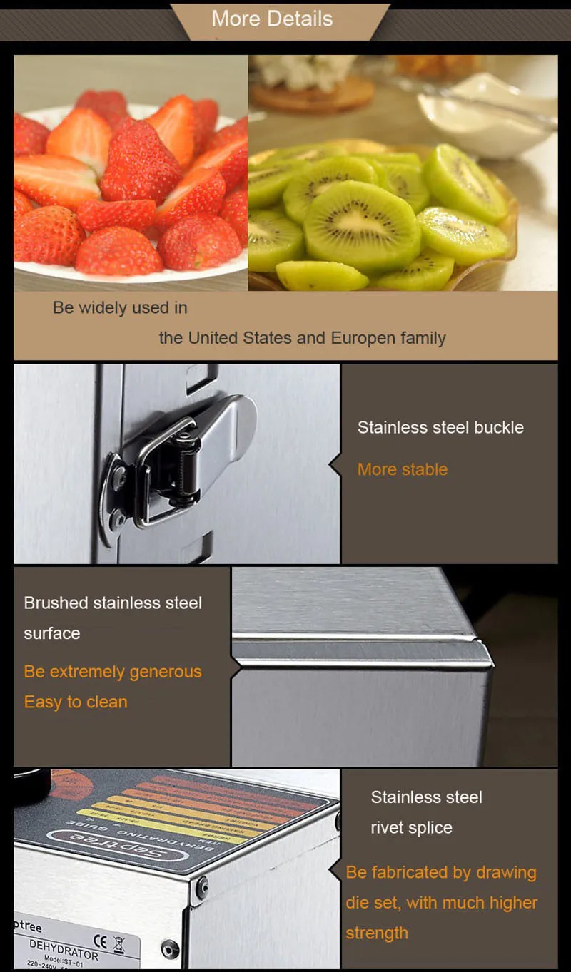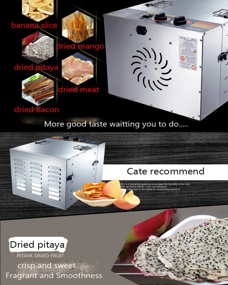 Энергосбережение, низкое энергопотребление и может сушить овощи, фрукты, травы, бобы, мясо, рыбу, хлеб, грибы и так далее. С горячим ветром, чтобы высушить их, не добавляется пигмент или клей или аромат. В то же время питание остается, и время сохранения дольше. Это удобно, чтобы сделать натуральную еду с богатым вкусом для человека или семьи. Это более легко держать и больше вкуса (сухофрукты отличаются от свежих фруктов, потому что они высушены и содержит минеральные предметы, и питание лучше заблокировано внутри). Температура не будет превышать 100 ℃, это не нарушит пищевое питание. Регулируемая температурная конструкция, вы можете установить разную температуру в соответствии с различными продуктами питания, чтобы достичь лучшего.