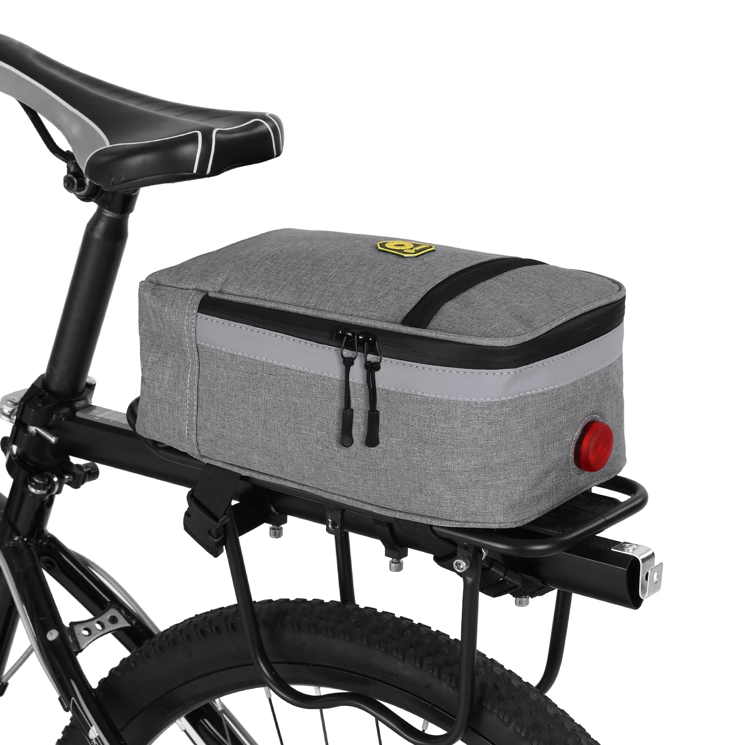 Этот задний стеллаж для велосипеда изготовлен из полиэфирной ткани, толстой пены и ПВХ-подкладки, чтобы обеспечить максимальную защиту ваших вещей. Он имеет широкую отражающую полосу и красный предупреждающий светильник, чтобы увеличить видимость в ночное время и безопасность езды. С двумя эластичными ремешками и быстросъемными пряжками сумка очень проста в установке на стойку велосипеда. Это отличная сумка для путешествий, езды на велосипеде, покупок и т. д.