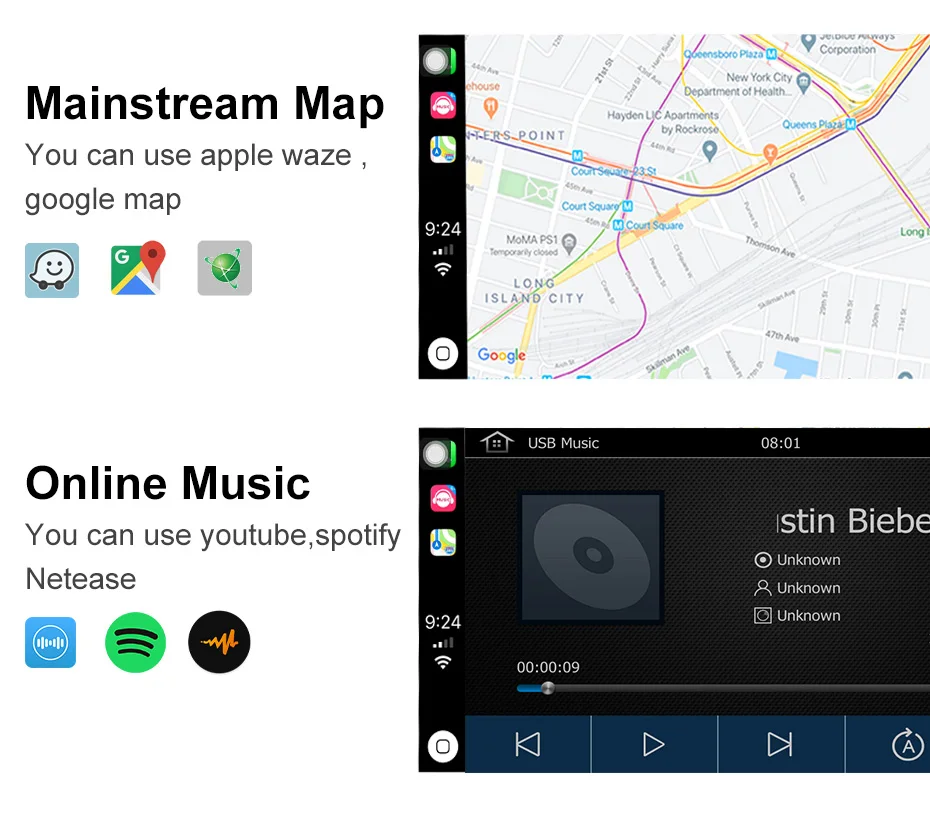 Голосовое управление: Поддержка Siri/музыка/карты/телефонные звонки/сообщения/аудио книги. Функция Siri поможет вам позвонить Розе или любому из ваших друзей. Пожалуйста, обратите внимание, что скорость работы нашего устройства зависит от скорости вашего телефона на ios. Сенсорный экран и hd-дисплей: направленное управление и просмотр телефона на автомобильном навигационном экране с помощью usb-кабеля. Свободные руки и безопасное вождение: совершать/отвечать на звонки, проверять голосовые сообщения, текстовые сообщения и создавать карты. Слушайте ваши любимые песни с помощью приложений в формате «hands free», «Apple Music» или «Apple Music».