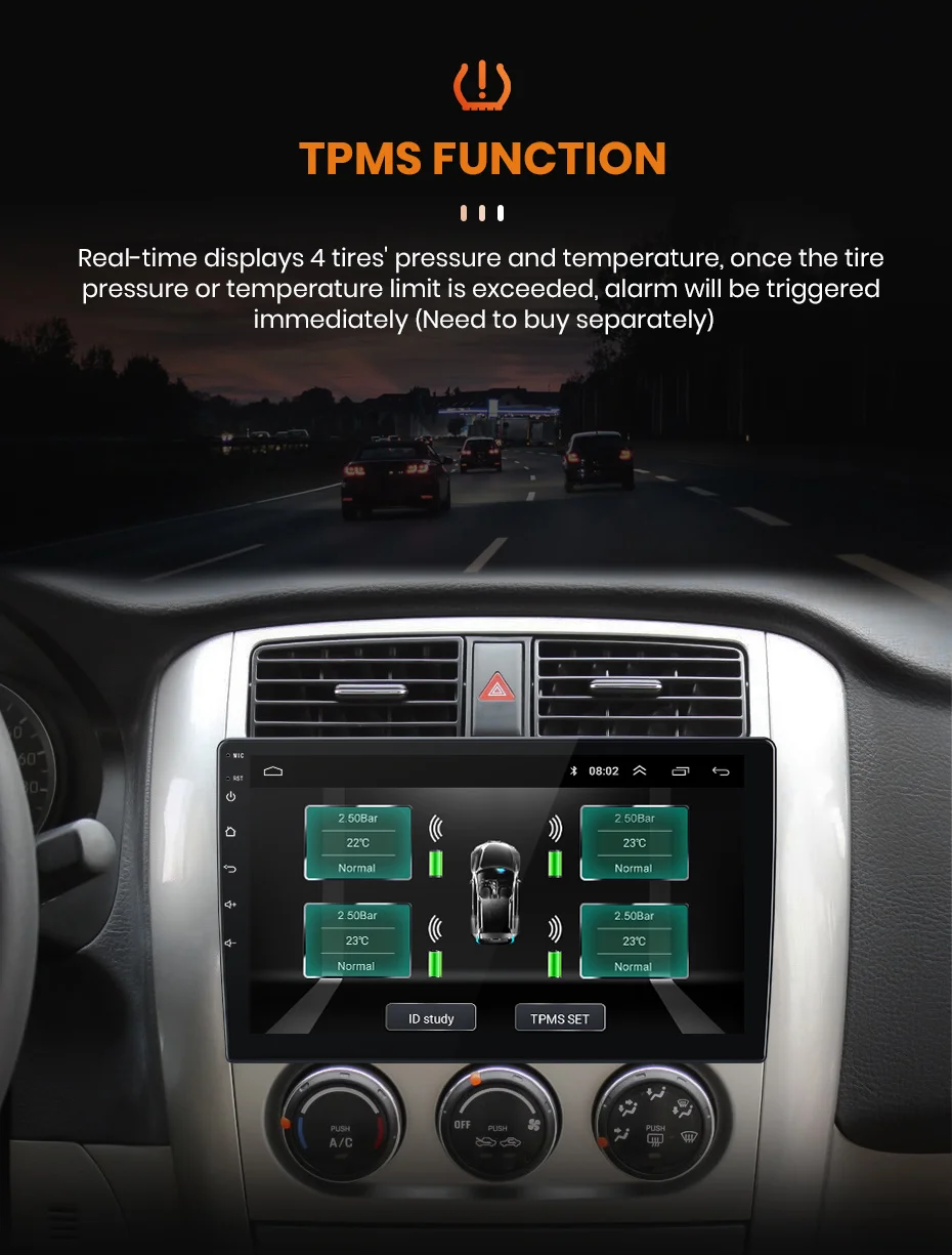 Отображает 4 давления и температуры в режиме реального времени. Как только давление или температура в шинах будут необычными, сразу же будет сигнал тревоги.