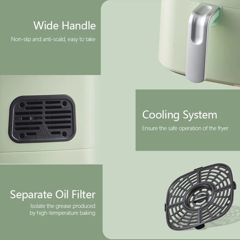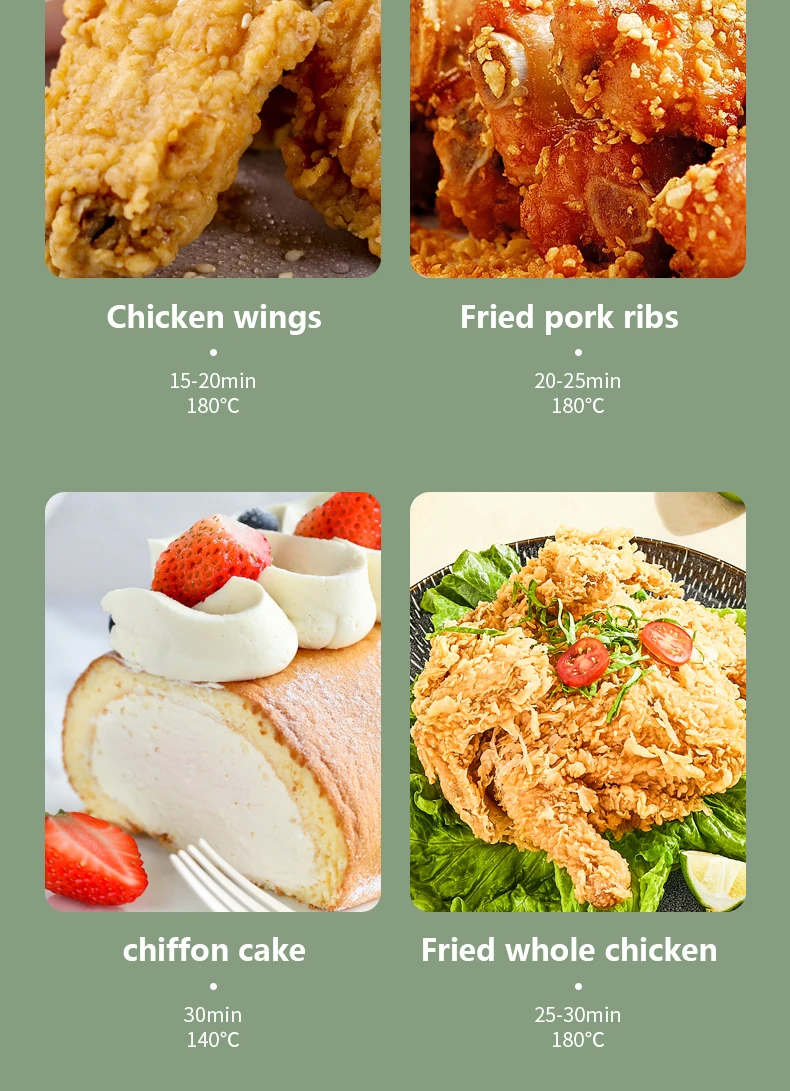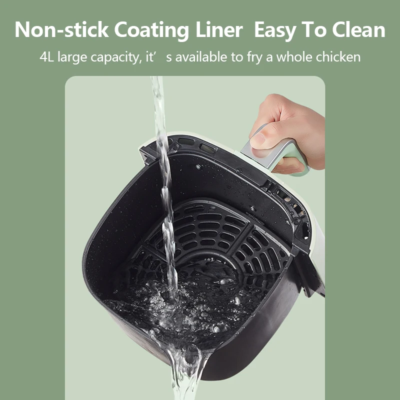 Подходит для всех видов приготовления пищи, fРид, гПросверленный, bAking, tHaw. Верхний вход воздуха, предотвращает попадание воды внутрь машины во время очистки и гарантирует, что свежий воздух поступает в машину Антипригарное покрытие, удобно чистить 4л большой емкости, он доступен для обжарки целой курицы Умное сенсорное управление, функция отключения памяти