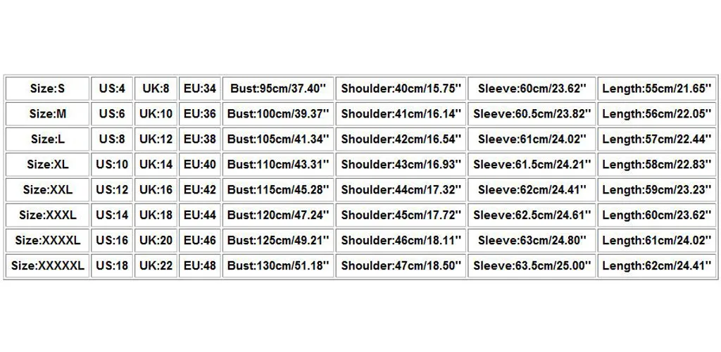 Пожалуйста, сравните детали размеров с вашими перед покупкой! Цвета могут немного отличаться в зависимости от настроек компьютера и монитора Допускается погрешность в 1-3 см Размеры США Великобритания ЕС Бюст Плечо Рукав Длина S 4 8 34 95 см/37,40 дюйма 40 см/15,75 дюйма 60 см/23,62 дюйма 55 см/21,65 дюйма М 6 10 36 100 см/39,37 дюйма 41 см/16,14 дюйма 60,5 см/23,82 дюйма 56 см/22,05 дюйма L 8 12 38 105 см/41,34 дюйма 42 см/16,54 дюйма 61 см/24,02 дюйма 57 см/22,44 дюйма XL 10 14 40 110 см/43,31 дюйма 43 см/16,93 дюйма 61,5 см/24,21 дюйма 58 см/22,83 дюйма XXL 12 16 дюймов 42 115 см/45,28 дюйма 44 см/17,32 дюйма 62 см/24,41 дюйма 59 см/23,23 дюйма XХХL 14 18 44 120 см/47,24 дюйма 45 см/17,72 дюйма 62,5 см/24,61 дюйма 60 см/23,62 дюйма XXXXL 16 дюймов 20 46 125 см/49,21 дюйма 46 см/18,11 дюйма 63 см/24,80 дюйма 61 см/24,02 дюйма XXXXXL 18 22 48 130 см/51,18 дюйма 47 см/18,50 дюйма 63,5 см/25,00 дюйма 62 см/24,41 дюйма