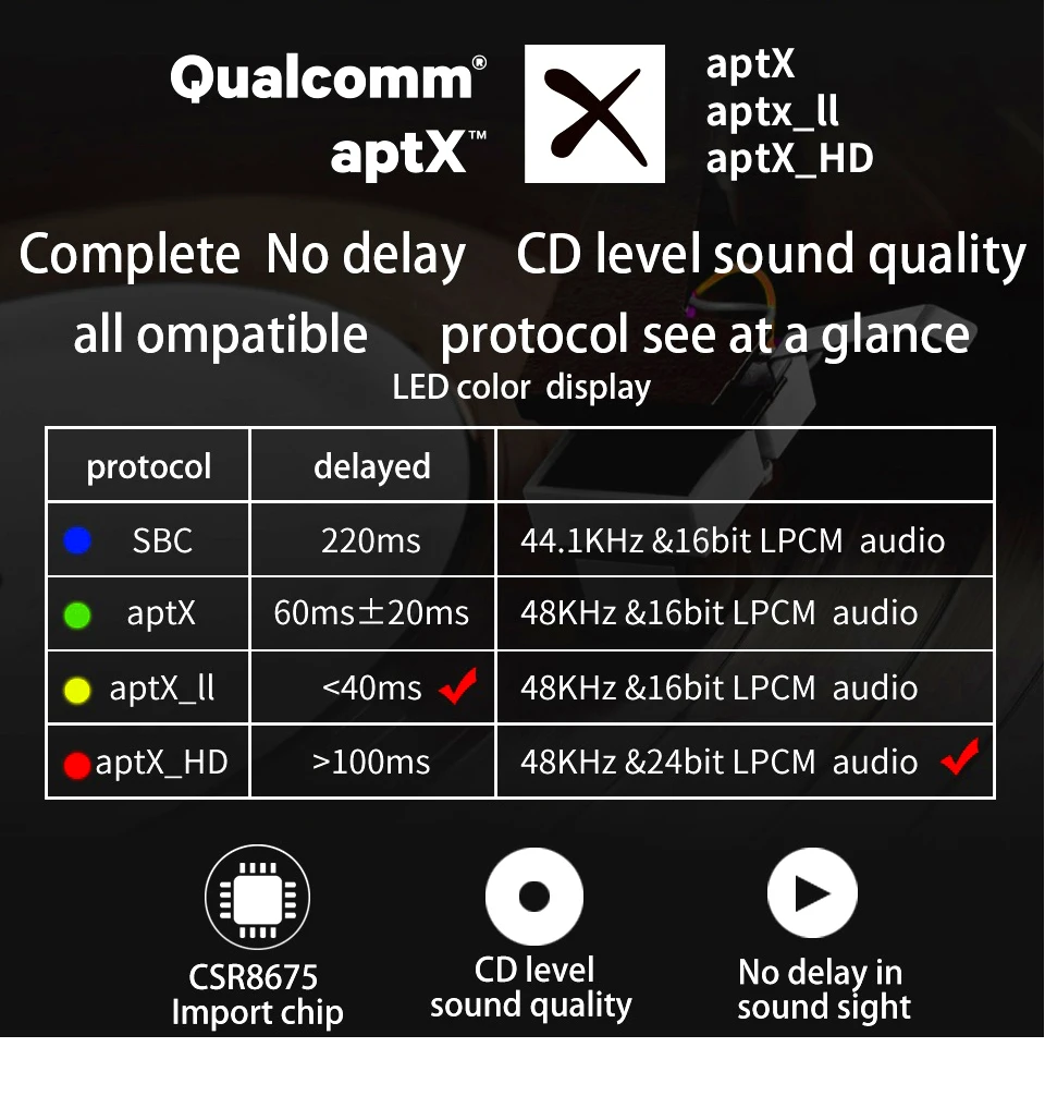 -Нет задержки синхронизации губ и идеальный hi-fi звук: технология AptX с низкой задержкой устраняет задержку звука Bluetooth, так что вы можете наслаждаться высокой четкостью звука и смотреть телевизор/фильм/видео в идеальной синхронизации. Технология aptX HD обеспечивает идеальное звучание.