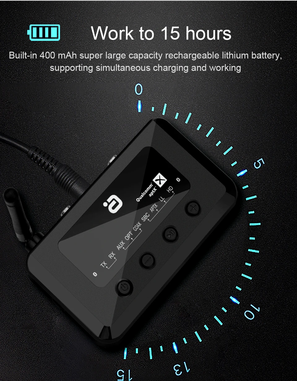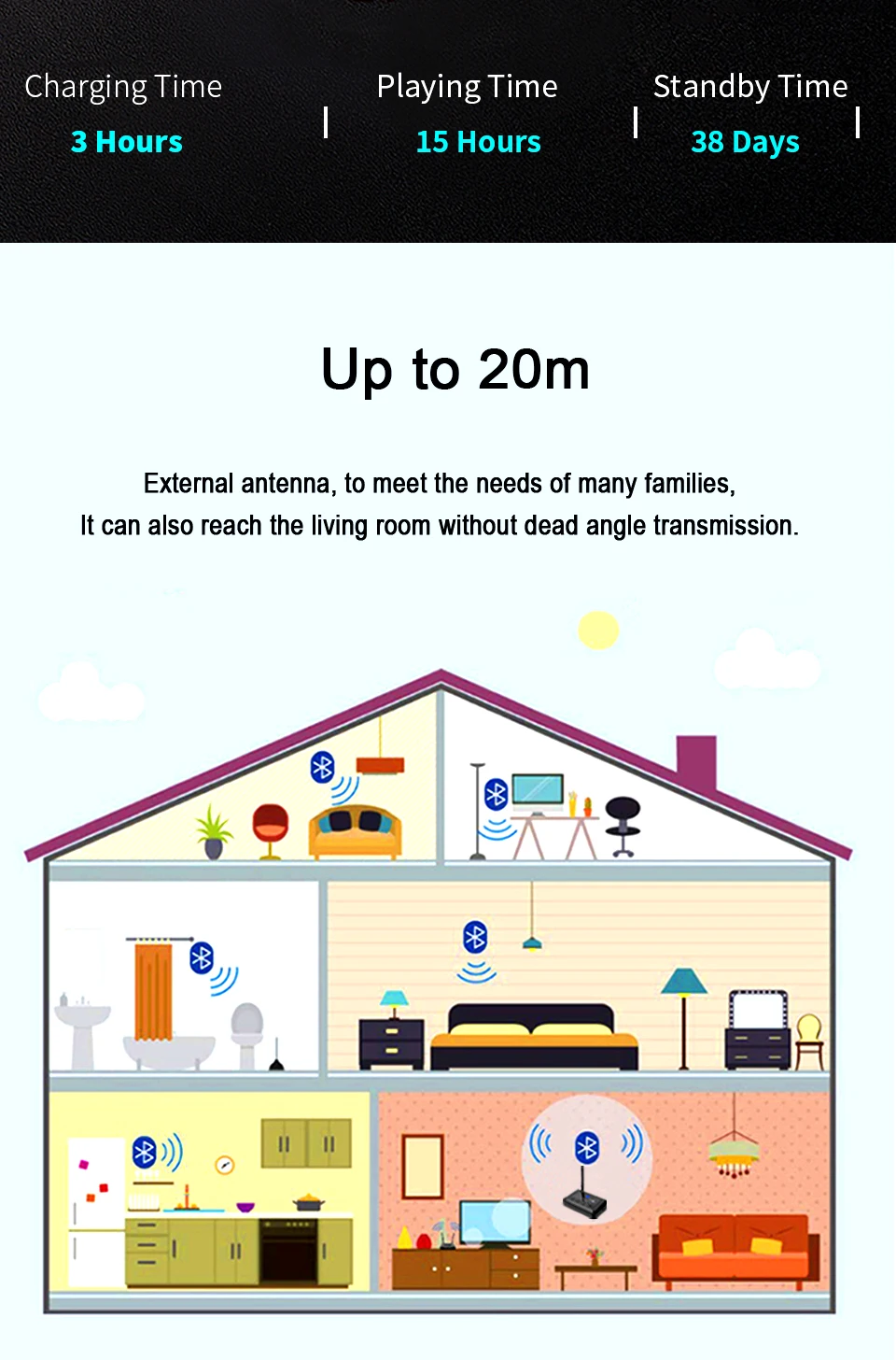 【15 часов в режиме ожидания】 Встроенный мощный аккумулятор емкостью 400 мАч, он обеспечит 15 часов за одну зарядку, вы также можете использовать его во время зарядки. Поддерживает как RCA/3,5 мм aux аудио подключение цифровой/оптический аудио вход и выход, он совместим практически со всеми устройствами.