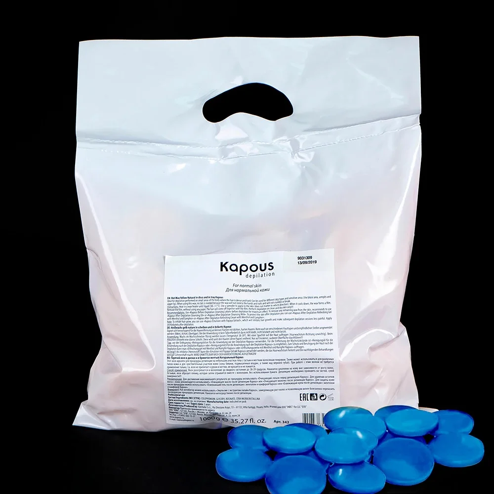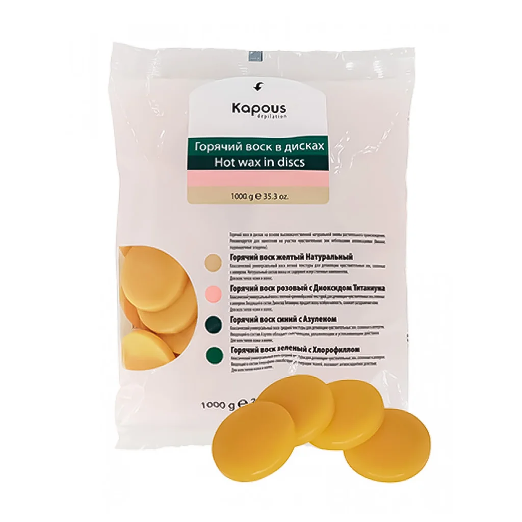 Горячий воск в дисках KAPOUS, 1000 гСредство: Горячий воск в дискахСтрана изготовителя: ИТАЛИЯГорячий воск зеленый с Хлорофиллом в дисках, 1000 гКлассический, универсальный воск плотной текстуры. Входящий в состав Хлорофилл способствует регенерации тканей, оказывают антиоксидантное действие. Подходит для депиляции деликатных, чувствительных зон, склонной к аллергии, для всех типов кож и волос. Горячий воск в дисках на основе высококачественной, натуральной смолы растительного происхождения, парафина и масел. Подходит для всех типов кожи и волос. Рекомендуется для нанесения на участки чувствительных зон небольшими аппликациями (подмышечные впадины, бикини). Время застывания аппликации на коже 3 - 4 секунды. Не требует использования бандажных полосок.