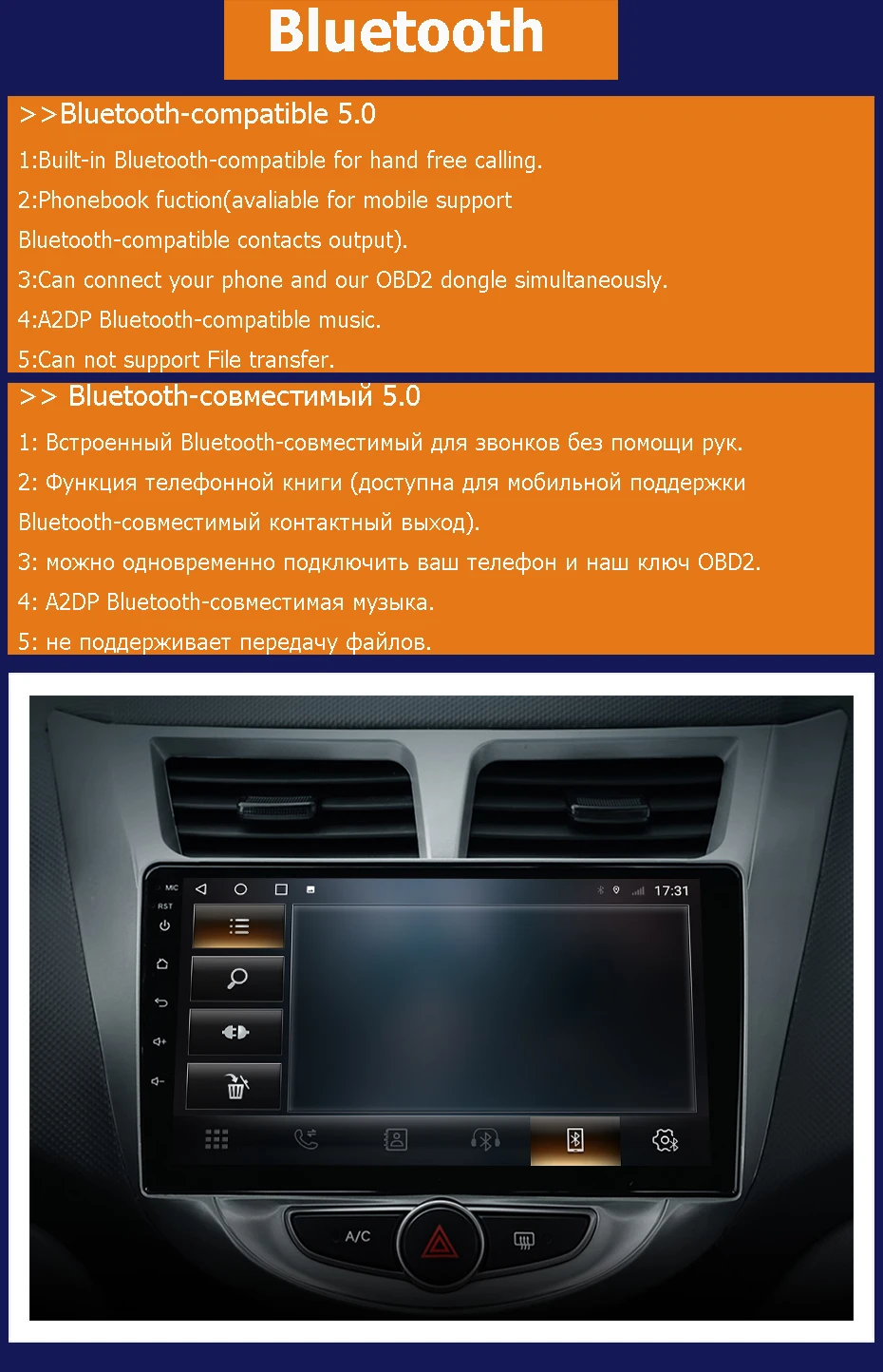 > Rohm 32107 <ограничено некоторыми моделями>-это мощный чип DSP, который позволяет вам иметь больше энергии для управления звуком различных частот. Вы можете контролировать время воспроизведения четырех динамиков автомобиля. Это ощущение окружения дает вам более продвинутые слуховые удовольствия.> Изображение на картинке/Минимизируйте видеопроигрыватель по умолчанию и смотрите видео при использовании navagation,browser и т. д.> FM/AM/RDS радио/1. Функция автоматического или ручного поиска станции./2.AM/ FM радио (AM 2 полосы, FM 3 полосы).> Совместимость с Bluetooth 5,0/1. Встроенный Bluetooth-совместим для звонков без рук./2. Функция телефонной книги (доступна для мобильных устройств с поддержкой Bluetooth-совместимых контактов)./3.можно подключить ваш телефон и наш ключ OBD одновременно./4.A2DP Bluetooth-совместимая музыка (доступна для мобильной поддержки Bluetooth аудиовыхода)./5.не поддерживается: передача файлов.> Крутая 3D навигация/1. Встроенный GPS, более сильный gps-сигнал./2. Карта может работать с фоном для достижения функций музыкальной навигации. 3. Поддержка функции двойной зоны GPS, пассажиры могут продолжать воспроизводить мультимедиа во время вождения navigating.4. Поддержка карт: g oogle/here/sygic/tom/waze/i go/Navitel/Yandex, и так далее/5. Предварительно Установите автономную карту внутри радиовспышки, если у нас нет карты вашей страны, мы оставим вам сообщение.> Управление рулевым колесом/Удаленный Адаптер рулевого колеса готов безопасно контролировать вашу музыку на ходу, с этой функцией, вы можете пристально фокусироваться прямо впереди, что сделает вождение более безопасным.> Мультимедийная функция/Поддержка 48 эквалайзеров <ограничено некоторыми моделями> для музыки, видео-дисплея альбома, названия песен, имени певца, лирической информации от игрока по умолчанию. Поддержка видео full HD 1080P пикселей./Поддержка формата Мультимедиа: MP3, VMA,MPEG1/2/4,JPEG,DVIX,CD-DA,CD-текст./Поддержка воспроизведения памяти точки останова./Поддержка музыкальных форматов без потерь.> Поддержка OBD2/вы можете подключить bluetooth-совместимый сканер OBD2 для использования этой функции.> Поддержка AHD камеры заднего вида. Подарок на обратную камеру бесплатно.> Поддержка DAB +/1. Подключите с DAB + Box через порт USB для использования функции DAB +./2. Поддержка ввода цифровых радиопрограмм и сенсорного управления./3. Поддержка сенсорного экрана для поиска программ./Советы: не включая DAB + BOX, предлагаем вам купить его у нас.