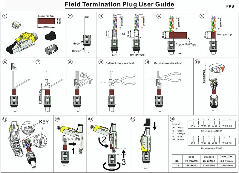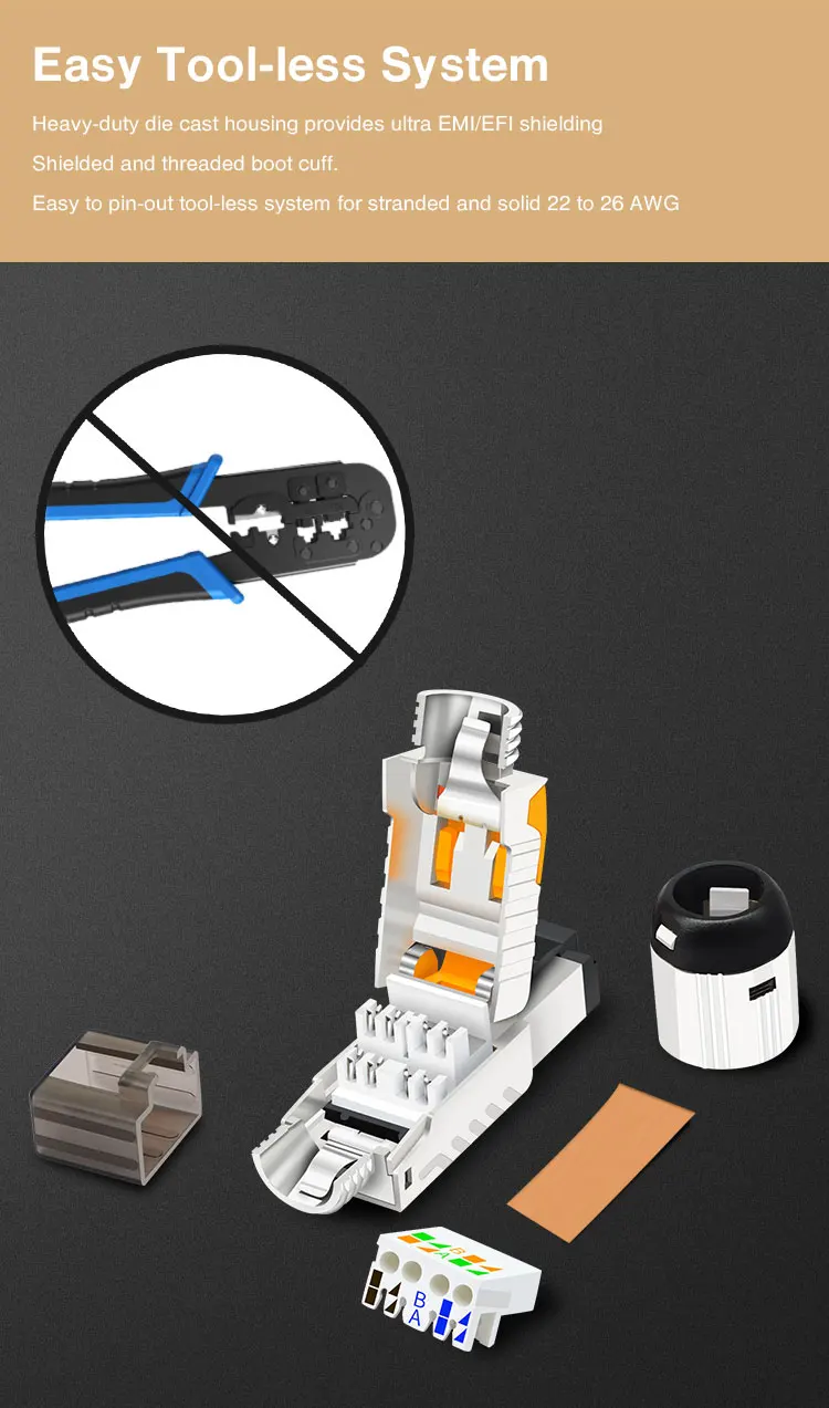 【Compatibility】Supports 22-26 AWG экранированный провод с внешним диаметром 7,0 мм и 8,5 мм. PoE PLUS совместим с приложениями IEEE 802,3 at Power over Ethernet (PoE +); Поддерживает автоматическое согласование Cat8. Модули IDC могут быть подключены Для конфигураций T568A или T568B. Полная обратная совместимость.