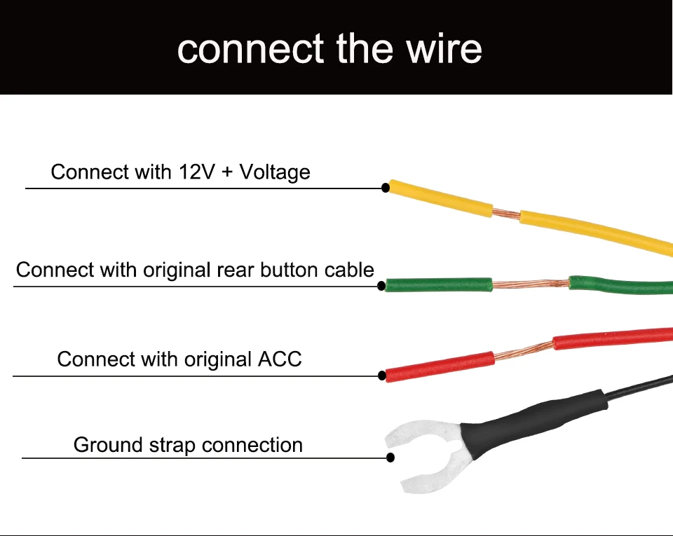 Red: Connect with original ACC Yellow: Connect with 12V + Voltage Black :Ground strap connection Green:Connect with original rear button cable