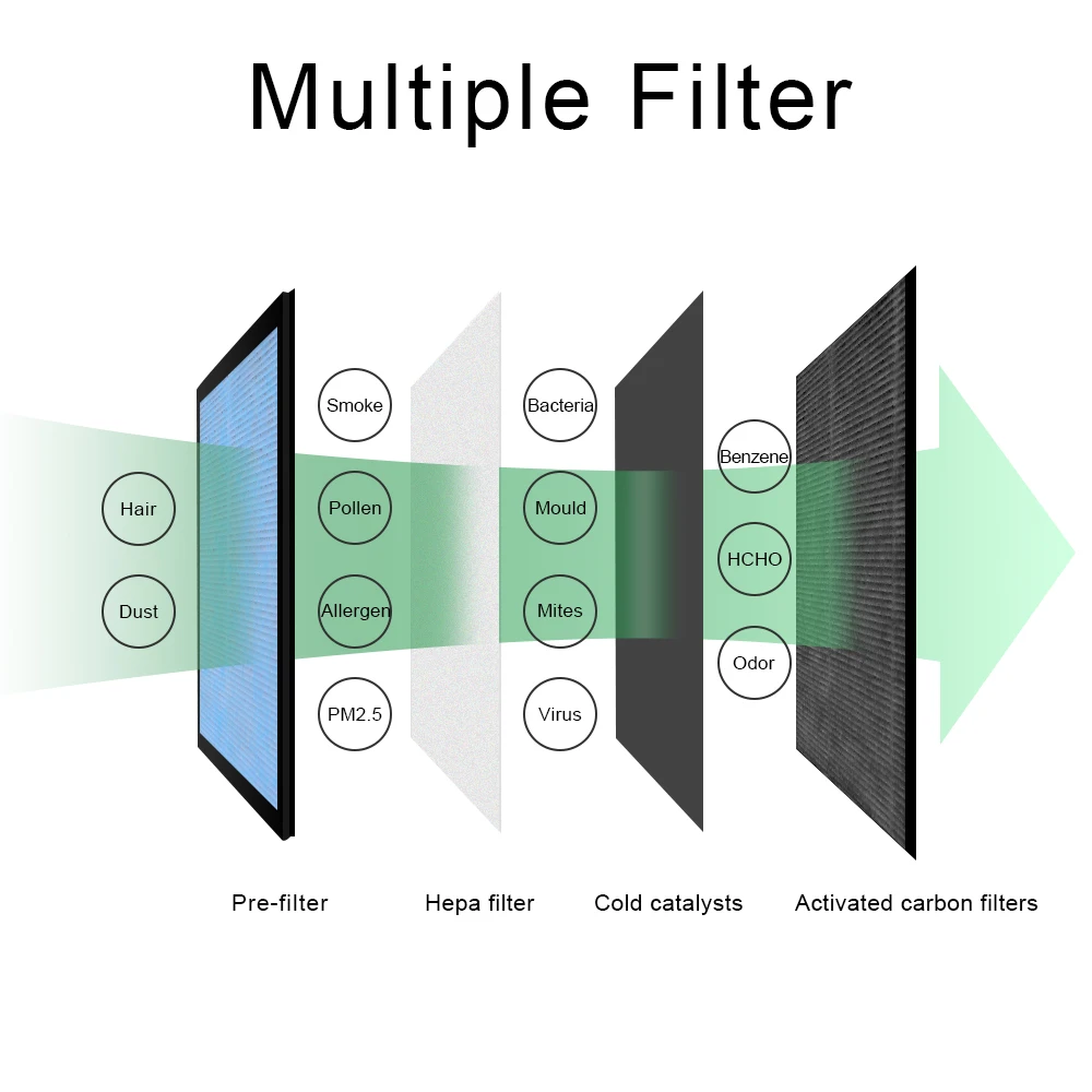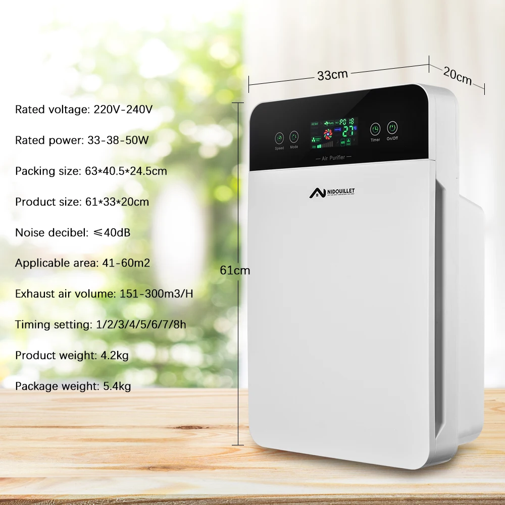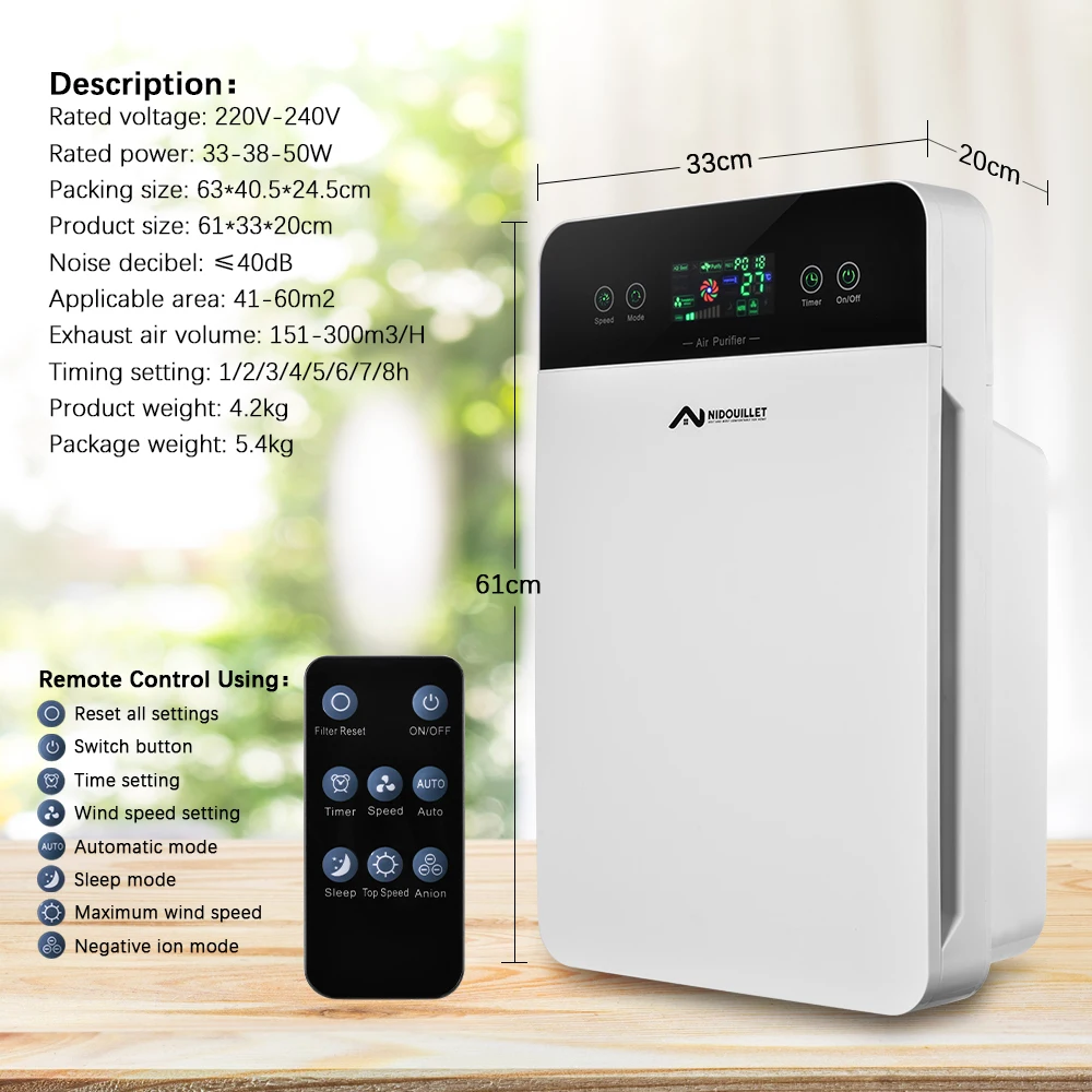 【Очистка воздуха 】очиститель воздуха использует высокоэффективные HEPA фильтры, холодные катализаторы и фильтры с активированным углем для фильтрации до 99.97% воздушно-десантных частиц, пыли, пыльцы, дыма, запахов, плесени и ПЭТ dander, И генератор отрицательных ионов может быть объединен и нейтрализован загрязнителями воздуха для более чистой окружающей среды 【Множественный контроль s и ЖК-дисплей 】 сенсорный и инфракрасный пульт дистанционного управления 2 в 1, пульт дистанционного управления имеет максимальный диапазон управления 5 м, лежа на диване, кровать также может контролировать очиститель воздуха; Очиститель воздуха использует жидкокристаллический дисплей, обратная связь в реальном времени качества воздуха, генератор отрицательных ионов, 3 уровня скорости ветра, режим работы 【Low noise】очиститель воздуха производит менее 60 дБ звука при использовании; Звук после включения режима сна составляет менее 40 дБ, что хорошо подходит для сна. 【Настройка времени 】время может быть установлено в 1H, 2H, 3H, 4H, 5, 6H, 7H, 8H, индикаторы на ЖК-дисплее будут отображаться в порядке, экономия электроэнергии и экономия денег 【Используйте дальномер 】 максимальный диапазон очистителей воздуха 41-60m2, который может быть использован во всех домах и рабочих местах в этом диапазоне.