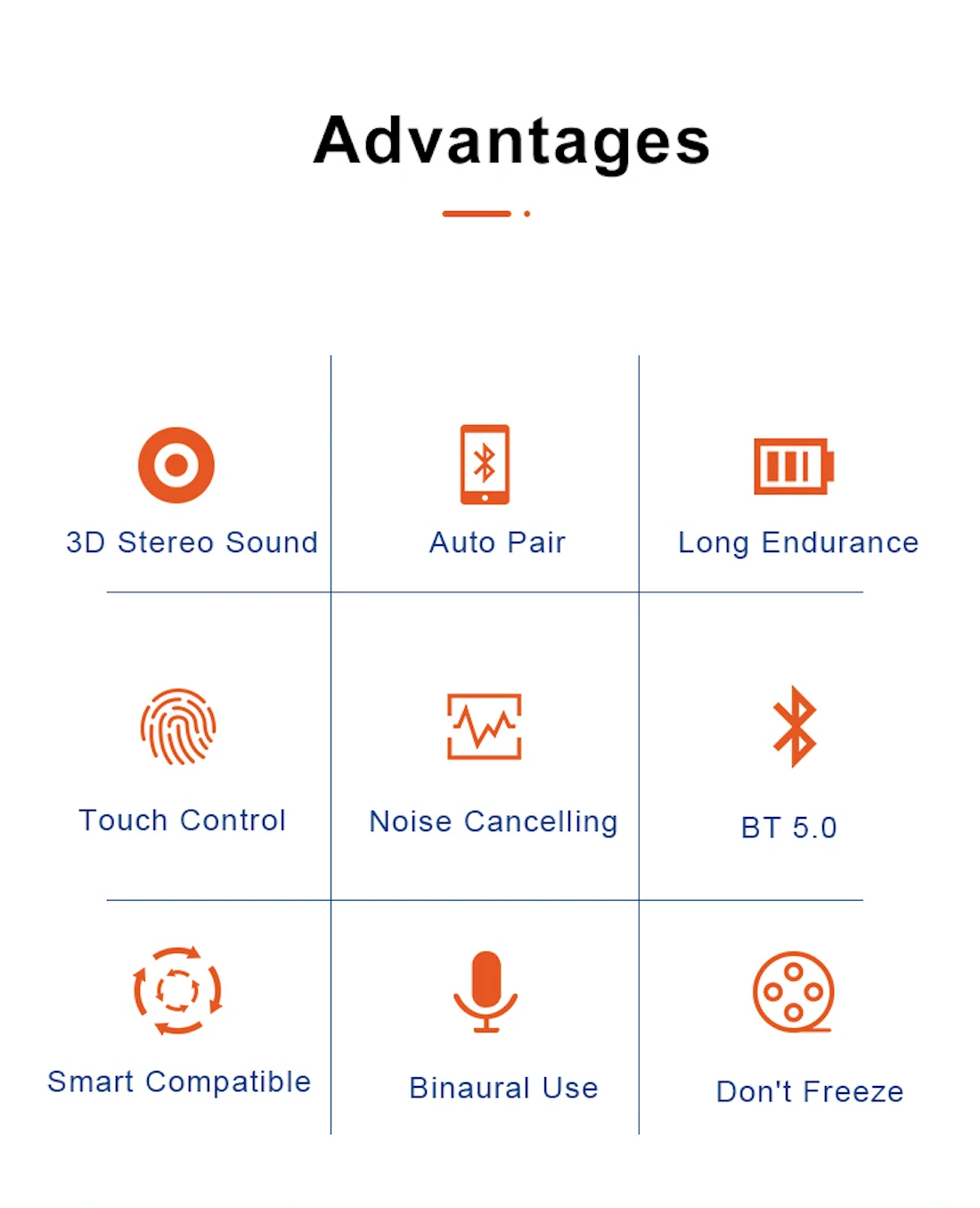 Характеристика: 1. Слушайте правильную песню, Поддерживайте песни и звонки, 2. Умное сенсорное управление по отпечаткам пальцев, тройной клик: левый звук, звук правого уха, Увеличение громкости 3. Откройте зарядную док-станцию и Автоматическое Сопряжение, откройте Bluetooth на своем телефоне и найдите «TWS», нажмите подключить его, затем это сделано 4. Поддержка различных мобильных устройств, Android, ios, может слушать песни, звонить, смотреть фильмы 5. 3D HiFI басовый звук, отлажен и протестирован более 10 раз с помощью профессиональной настройки Спецификация: 1. Bluetooth видение: 5,0 2. Характеристики: телефон, воспроизведение музыки, музыкальный плеер, вызов siri 3. Время работы: музыка: 3 часа; Телефонный звонок: 2,5 часа 4. Емкость аккумулятора: (внутренняя Защитная панель) затычки для ушей-40 мАч; Case-400mAh 5. Размер наушников: 46*18*24 мм 6. Размер Чехла: 63*55*32 мм 7. Размер и вес посылка: 103*72*44 мм; 151 г Посылка включает в себя: Коробка, Инструкция, зарядный кабель, наушники, зарядный чехол, наушники Наши продукты поддерживают оптовую продажу, дистрибьюторы могут купить.