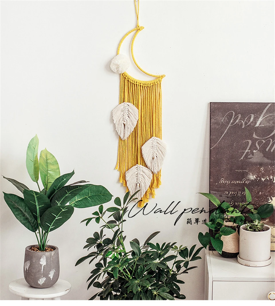 Материал: хлопковая нить, железная луна Узор: луноходовая ткань, листья Цвет: желтый, бежевый Посылка включает: 1 х макраме настенный (без светильник) Только вышеуказанная посылка, другие товары не включены. Примечание: светильник и различные дисплеи могут привести к тому, что цвет товара на картинке немного отличается от реального. Допускается погрешность в измерениях +/- 1-3 см.
