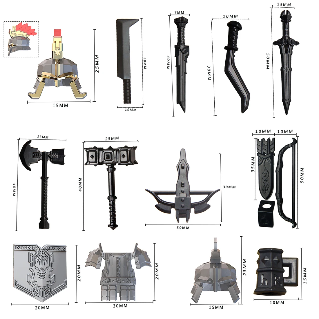 .Medieval Rome, Ancient Rome, Ancient Egypt figure military weapons armor kit. There are 101 pieces in total, including shields, swords, helmets, armor, breastplates, tools and other equipments. It can form a building block army when going with figures