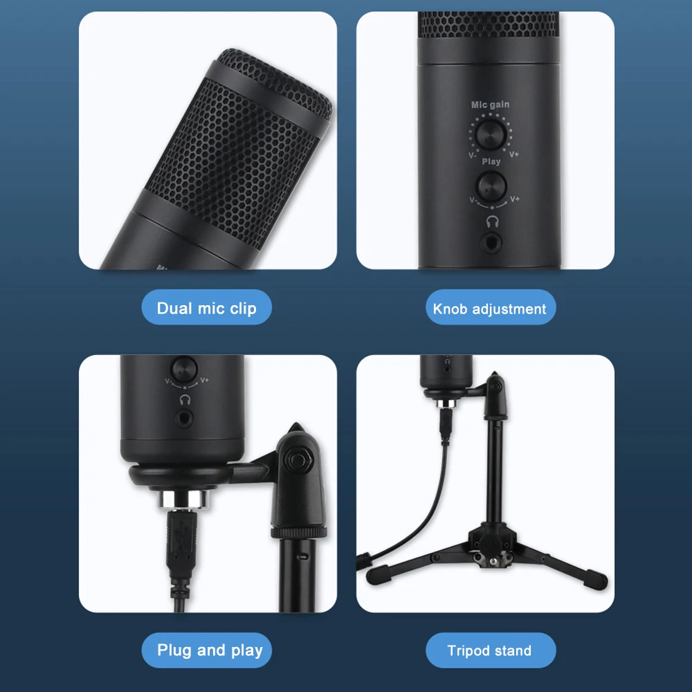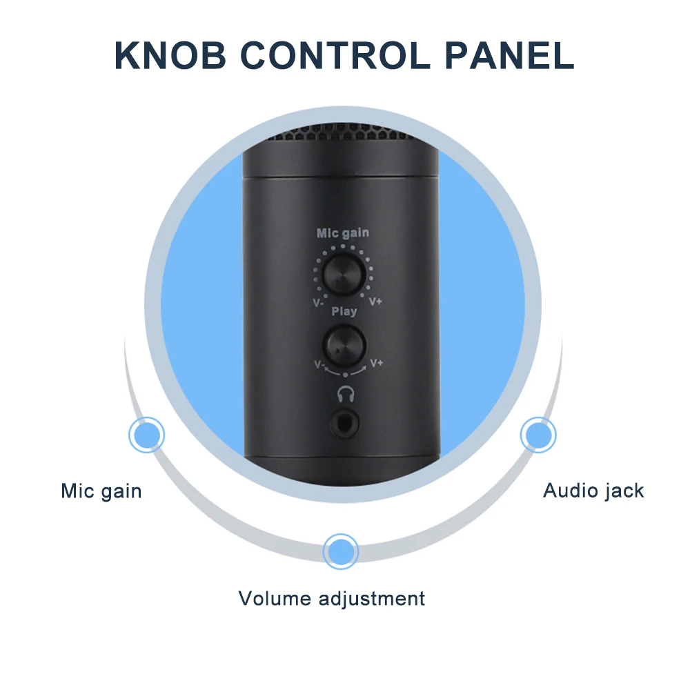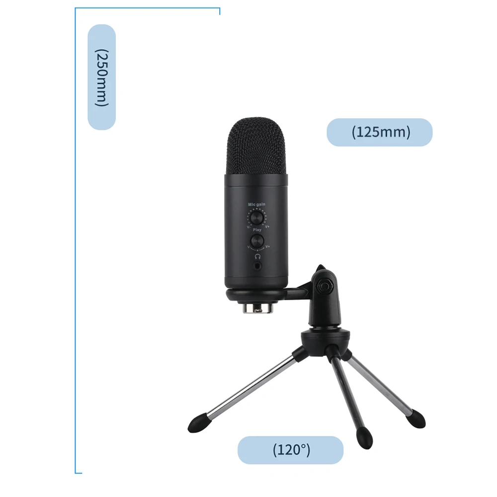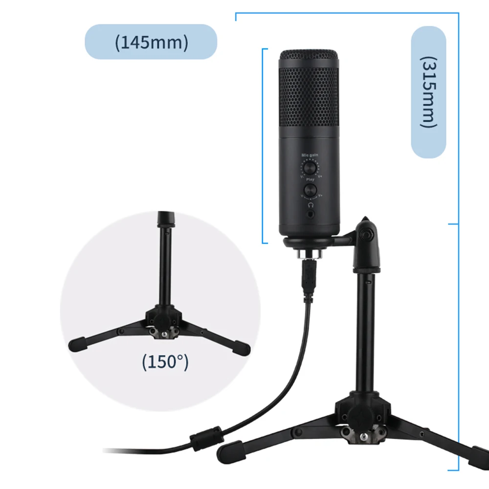 Микрофон-это кнопочная панель для управления усилением микрофона и громкостью, с аудиоразъемом. С акустическим фильтром для шумоподавления, штатив для стабильной поддержки. Подключи и играй, он подходит для записи студии и потоковой передачи.