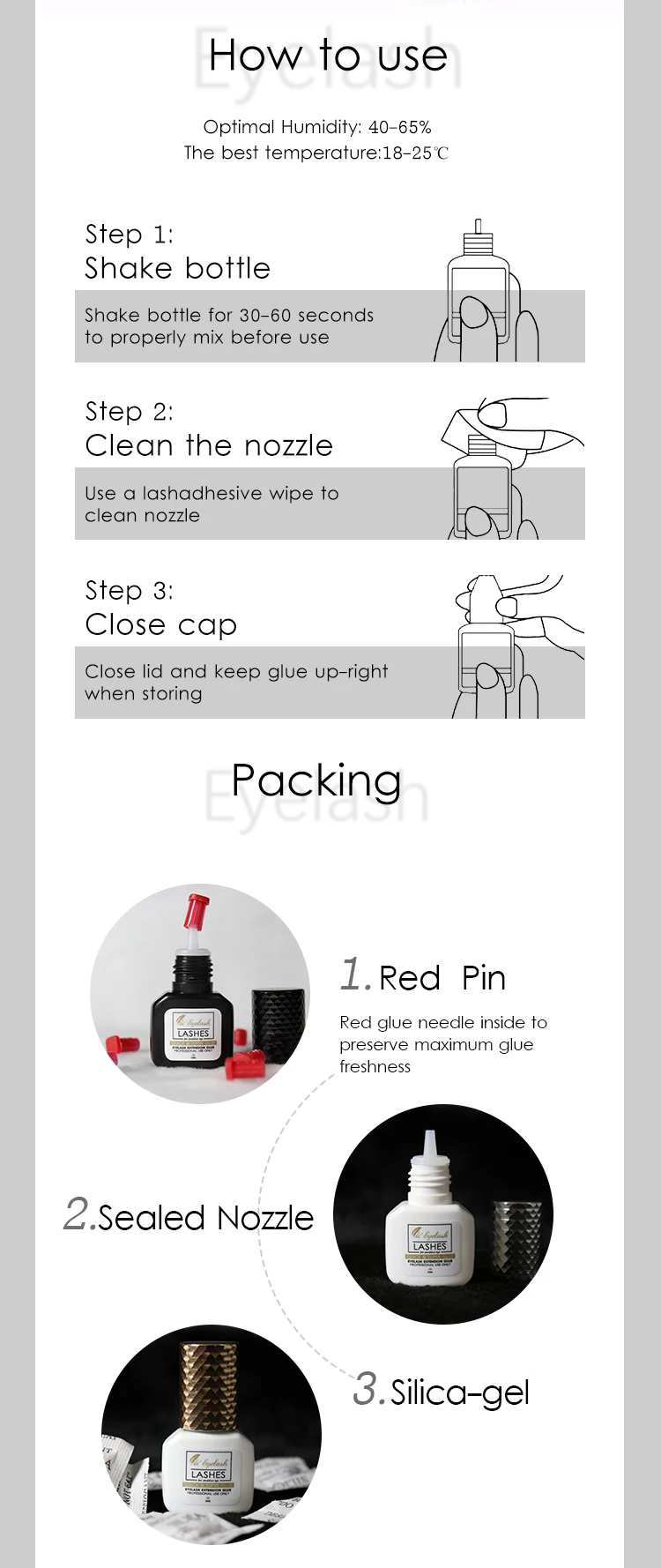 5ML 1S Eyelash Extension Quick & Super Glue 5ML 1S Eyelash Extension Quick & Super Glue Self Life: 2 months opened ,6 months unopened Made in korea Drying time: 1-second Lasting time: 6-8 weeks Optimal Humidity: 40-65% Consistency: Thin Fume: Minimum Color: Black Volume: 5 ml MINIMUM FUMES & STRONGEST BOND - Approximately 6-8 weeks bonding period and 1 second dry time, shake bottle for 30-45 seconds to properly mix before use. QUICK & SUPER GLUE: 1.KEEP LASH EXTENSIONS LONGEST LASTING TIME – The Quick & Super Glue has an extra strength formula that holds the eyelash extensions in place for up to 6-8 weeks. 2.FASTEST DRYING LASH ADHESIVE – With a record drying time of just 1 second, you will be able to service you customers much faster and more efficiently. Volume eyelash extensions require a quick drying eyelash extension adhesive to maintain consistency in your volume fans and Classic lashes. 3.THE SAFE AND INGREDIENTS –Our eyelash extension adhesive is made of the highest quality ingredients that have been salon tested all over the world .Make sure that for professional use. 4.SAFETY & QUALITY : Hieyelash Adhesive is FORMALDEHYDE-FREE and LATEX-FREE, ultimately protecting both you and your client. FOR EXPERIENCED PROFESSIONAL USE ONLY – DO NOT USE ON SELF APPLICATION!!! FOR EYELASH EXTENSIONS ONLY – DO NOT USE WITH STRIP LASHES!!!