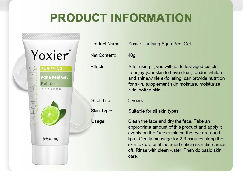 Информация о продукте Название продукта: гель для очищения кожи Аква Содержание нетто: 40 г Эффекты: после использования, вы получите потерю состаренной кутикулы, чтобы насладиться вашей кожей, чтобы иметь чистую, нежную, белую и блестящую. Во время отшелушивания, может обеспечить питание для кожи, дополняет кожу влагой, увлажняет кожу, смягчает кожу. Срок годности: 3 года Типы кожи: подходит для всех типов кожи Использование: очистите лицо и высушите лицо. Возьмите соответствующее количество этого продукта и равномерно нанесите его на лицо (Избегайте области глаз и губ). Мягко массируйте в течение 2-3 минут по текстуре кожи до тех пор, пока не состаренная грязь для кутикулы не оторвется. Краску в чистой воде. Затем сделайте базовый уход за кожей.