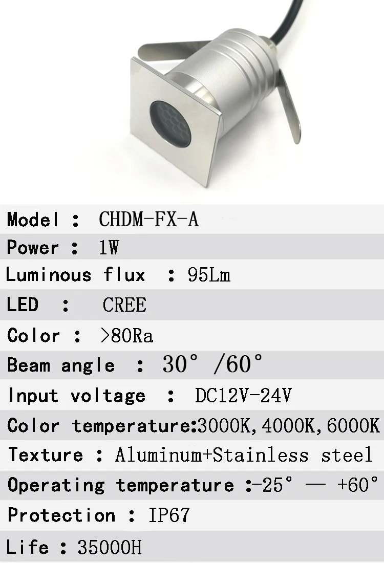 Мощность: 1 вт светодиодный подземный светильник Светодиодный: CREE-XBD светодиодный Люмен: 95 лм/Вт Вход Напряжение: DC12V-24V Светильник угол луча: 60 ° Класс защиты: IP67 водонепроницаемый Основной материал: верхняя сторона (нержавеющая сталь), корпус (6063 алюминий) Рабочая температура: -25 °C ~ + 45 °C Кабель: DC12V с водонепроницаемым клеммом 36 см Гарантия: 3 года с CE и ROHS, Цветовая температура: теплый белый (2700-3000K), натуральный белый (4000-4500K), холодный белый (6000-6500K) другие варианты: красный, зеленый, синий Использование: напольный светильник, настенные лапки светильник, дорожный боковой светильник, квадраты светильник, дорожки светильник, сад светильник, мосты светильник и другие открытый венера светильник ing