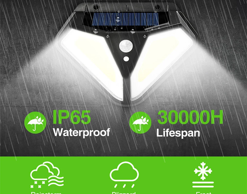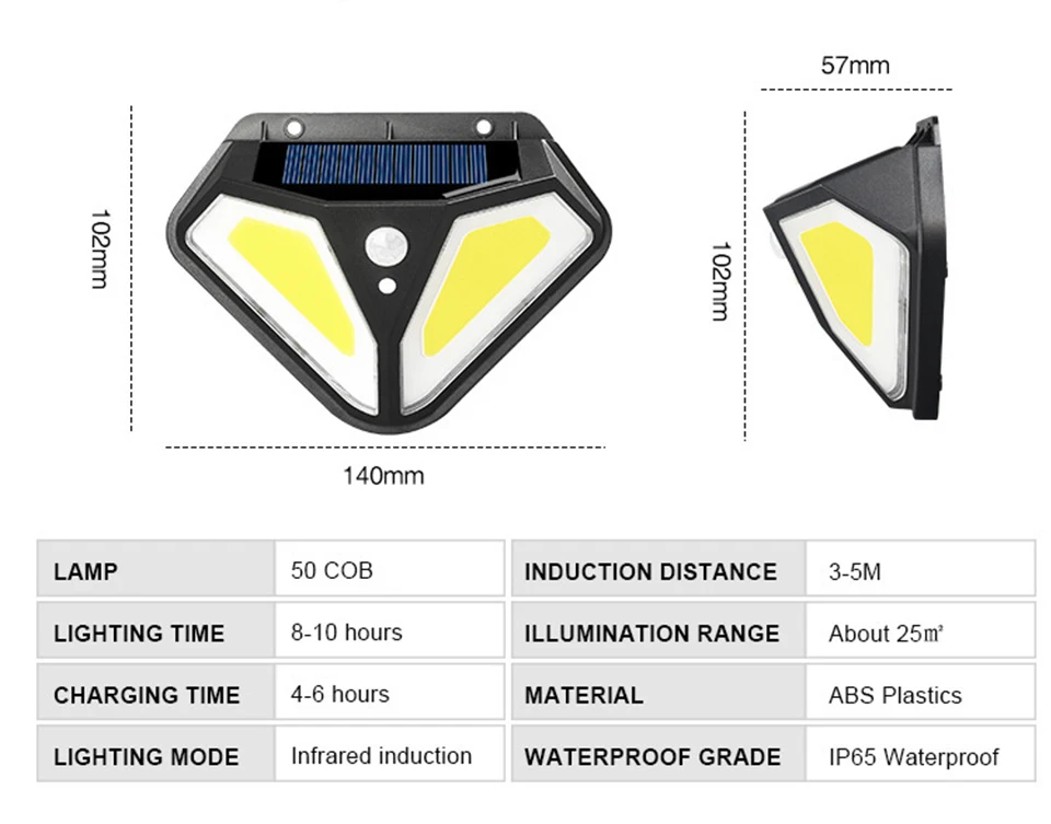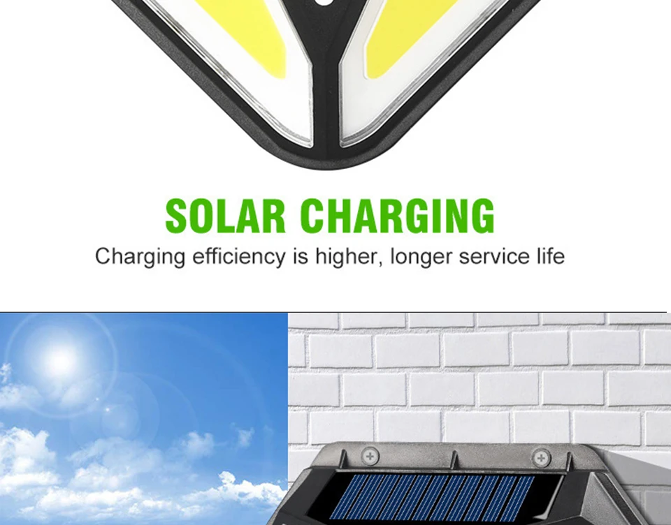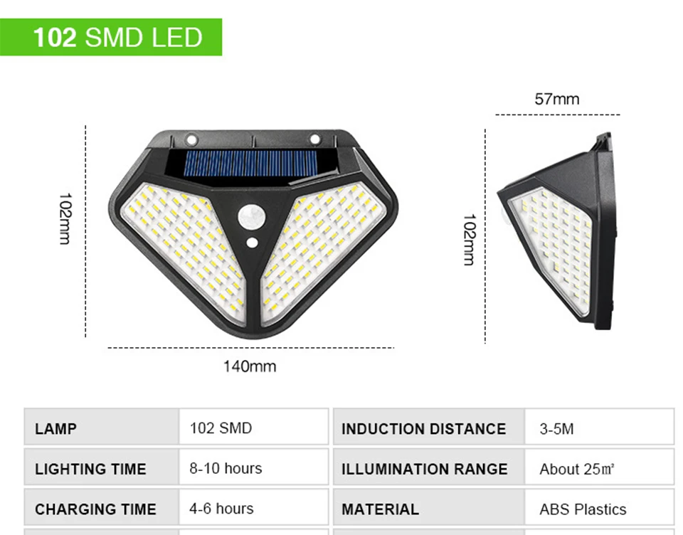 Особенность: 1. Хорошее качество: используется высококачественный АБС-пластик, он долговечен для использования на улице и длительного использования. 2. Пассивный инфракрасный датчик движения: чувствительный инфракрасный датчик может обнаруживать движение людей на расстоянии от 3 до 5 м. Он автоматически контролирует включение и выключение света. 3. Водонепроницаемость IP65 Светильник изготовлен из АБС-пластика и водостойкого материала IP65. Он может работать в разные виды погоды, такие как Дождь Снег и туман. 4. Длительное время работы: если полностью зарядить аккумулятор более 8 часов с прямым солнечным светом, он будет держать свет более 8 часов 5. Питание от солнечной энергии: солнечная панель находится в верхней части лампы. Он автоматически сохранит электричество в течение дня. Пожалуйста, установите изделие в месте прямого солнечного света. Этот уличный фонарь на солнечной батарее является беспроводным. Вы можете установить его на стену 6. Супер яркий: намного ярче других ламп. Каждый дорожный светильник на солнечной батарее имеет превосходный-яркий защитный для глаз, без мерцания и без излучения белый светодиодный светильник s для освещения. Легко устанавливается на дерево стекло металл. Входное напряжение: 5,5 В Общая мощность: 20 Вт Тип лампы светодиодный Источник светильник: светильник Количество СВЕТОДИОДНЫЙ: 100pcs светодиодный/102pcs светодиодный 50COB Цвет светильник: белый Источник питания: 1*3,7 V 1200mAH литиевая батарея Время зарядки: 8 часов Время работы: более 8 часов Режимы управления светильник/PIR Высокая задержка света: 20-25 с Угол наклона датчика: 120 ° Расстояние датчика: 3-5 м Класс защиты: IP65 Материал: ABS Цвет изделия: черный Убедитесь, что светильник установлен в пределах 3 метров высоты и убедитесь, что солнечная панель может поглощать светильник. Перед использованием Включите переключатель. 1/2/4 * уличный светодиодный светильник на солнечной батарее 1/2/4 * Расширительная Труба 1/2/4 * винты 1/2/4 * Руководство пользователя