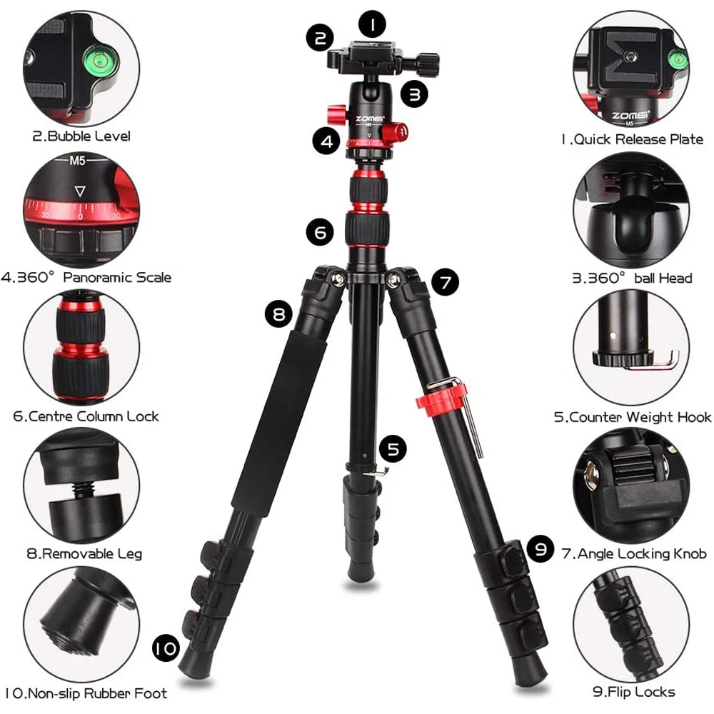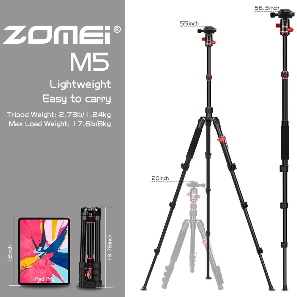 • 【Путешествия/OUTDOOR】 13,78 "компактный размер для хранения и легко носить с сумкой. Ножки штатива могут регулироваться тремя уровнями угла открытия для стабилизации на различных основаниях и наклонных уровнях. Подходит для путешествий или съемки на открытом воздухе. • 【FLEXIBLE】 панорама на 360 ° и шаровой шарнир: специально разработанная шаровая Головка может вращаться на 360 ° и получать свободные углы, позволяя вам каждый раз получать идеальный снимок и потрясающую панораму. • 【CONVENIENT】ZOMEi M5 штатив камеры от 16,14 "до 55" Гибкая регулировка. 4-секционный Колонка ноги с быстрое освобождение флип-замки позволяют регулировать рабочая высота от 16,14 "до 55" за считанные секунды. • 【Трансформа】zomei M5 штатив можно быстро разобрать с помощью винта центральной оси и трансформировать в монопод, обеспечивая альтернативный способ съемки с легкостью. • 【PORTABLE】 вес штатива 2,73lbs/1,24 kg и Максимальный вес нагрузки 17,6 lbs / 8kg. 13,78 "в сложенном состоянии и легко переносится. Этот штатив может сделать его лучшим компаньоном для ваших DSLR камер и выдерживать более тяжелую нагрузку по сравнению с аналогичными продуктами, но остается стабильным. Материал: Алюминий из алюминиевого сплава Размер хранения: 13,78 дюйма/35 см Максимальная высота: 56 дюймов/140 см Тип головки: металлическая шаровая Головка БЫСТРОРАЗЪЕМНАЯ пластина: в комплекте Секция ноги: 4 секции Тип фиксатора: фиксатор Вес нетто: 2,73lb/1,24 кг
