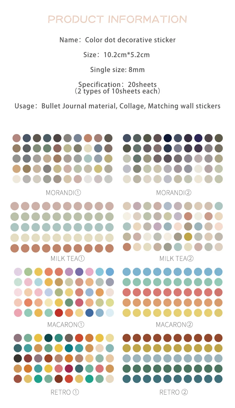 Материал: пластик Размер: 10,2*5,2 см Один размер: диаметр 8 мм Цвет: ретро цвет, Morandi, макарон, молочный чай цвет Упаковка: 20 листов/комплект 50 шт/листов (всего: 1000 шт)