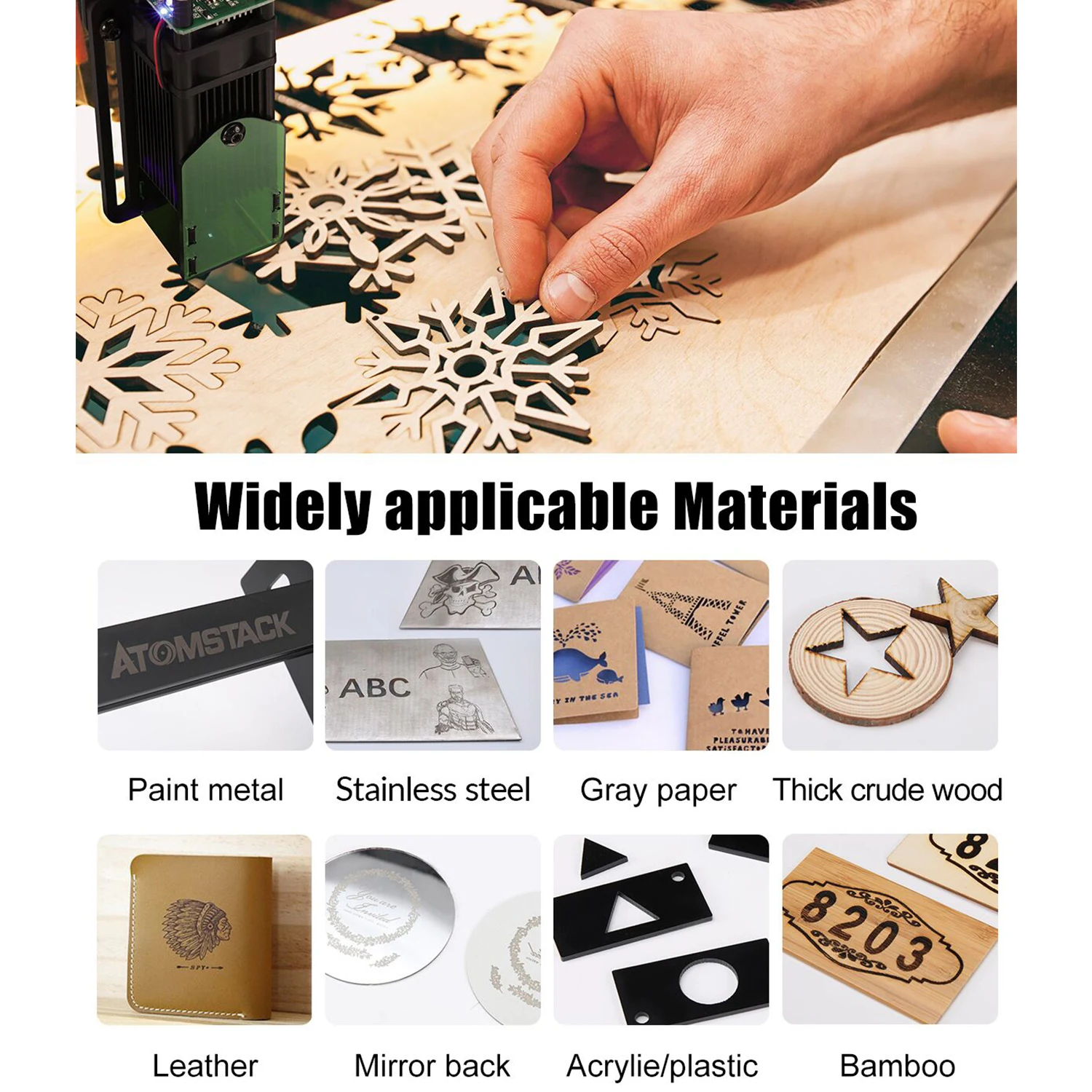 Предметы для резьбы: все дерево, бамбук, картон, пластик, кожа, печатная плата, оксид алюминия, неотражающее покрытие и Лакированный металл.