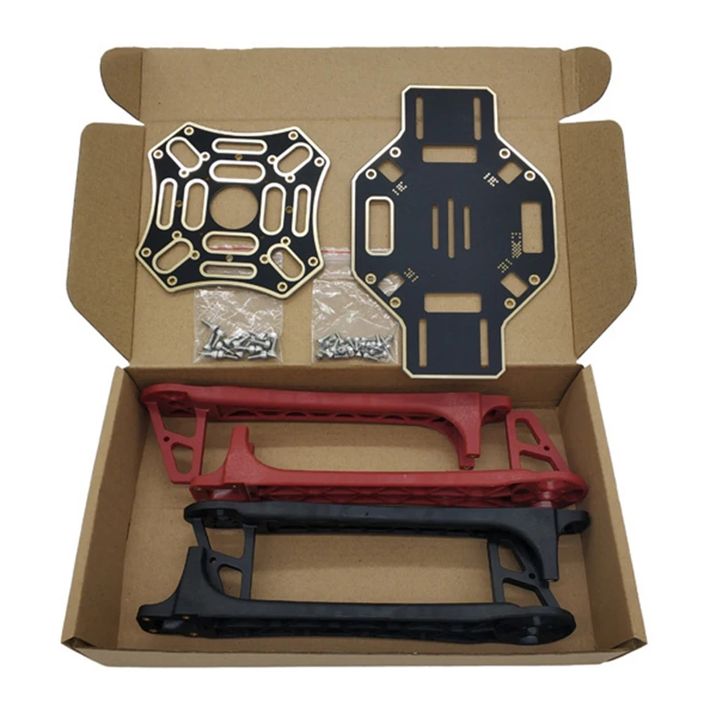 Rack parameters: Rack weight: 282 g rack + box total weight: 343 g Motor wheelbase: 450mm Takeoff weight: 800~1700g Configuration recommendation: Propeller 9443 1045 1047 Recommended battery 3S/11.1V/2200-5200MAH Recommended motor 2212~2216 (stator size) Recommended ESC 15A ~ 40A colour:Black + red Material:nylon size:Wheelbase: 450mm