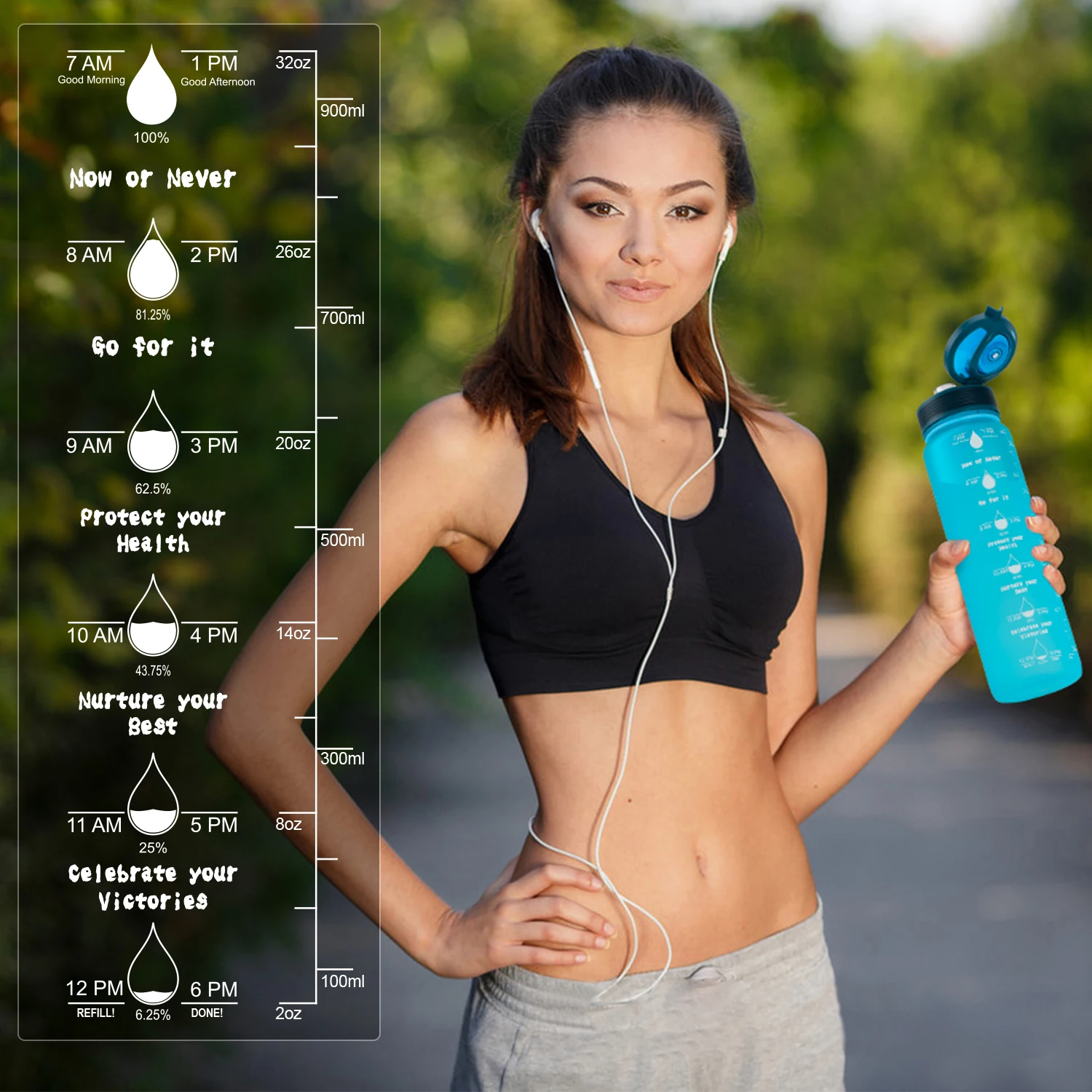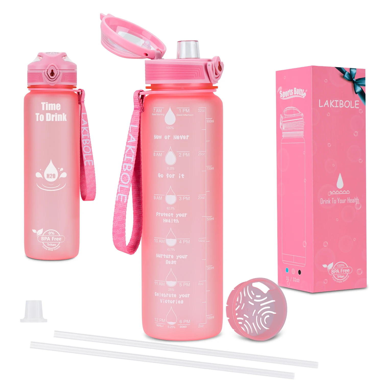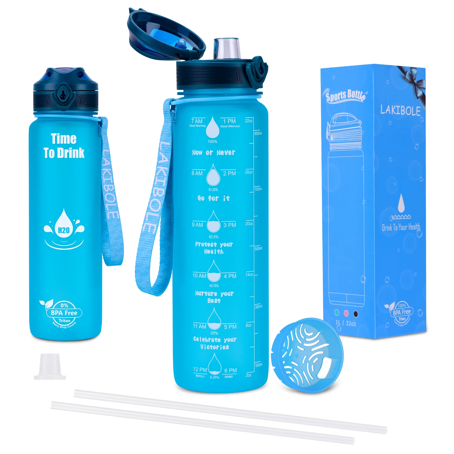 Упаковочный лист: 1 съемный колпачок для бутылки, 1 Мотивирующий корпус бутылки для воды, 1 силиконовый мундштук, 2 соломинки, 1 большой фильтр для частиц.