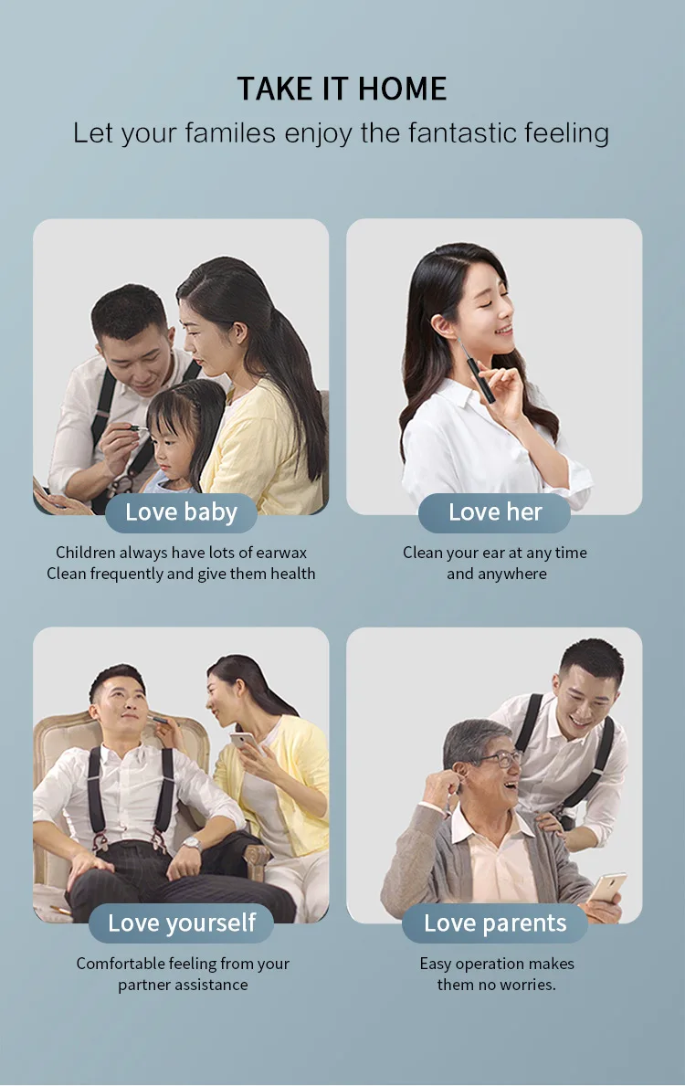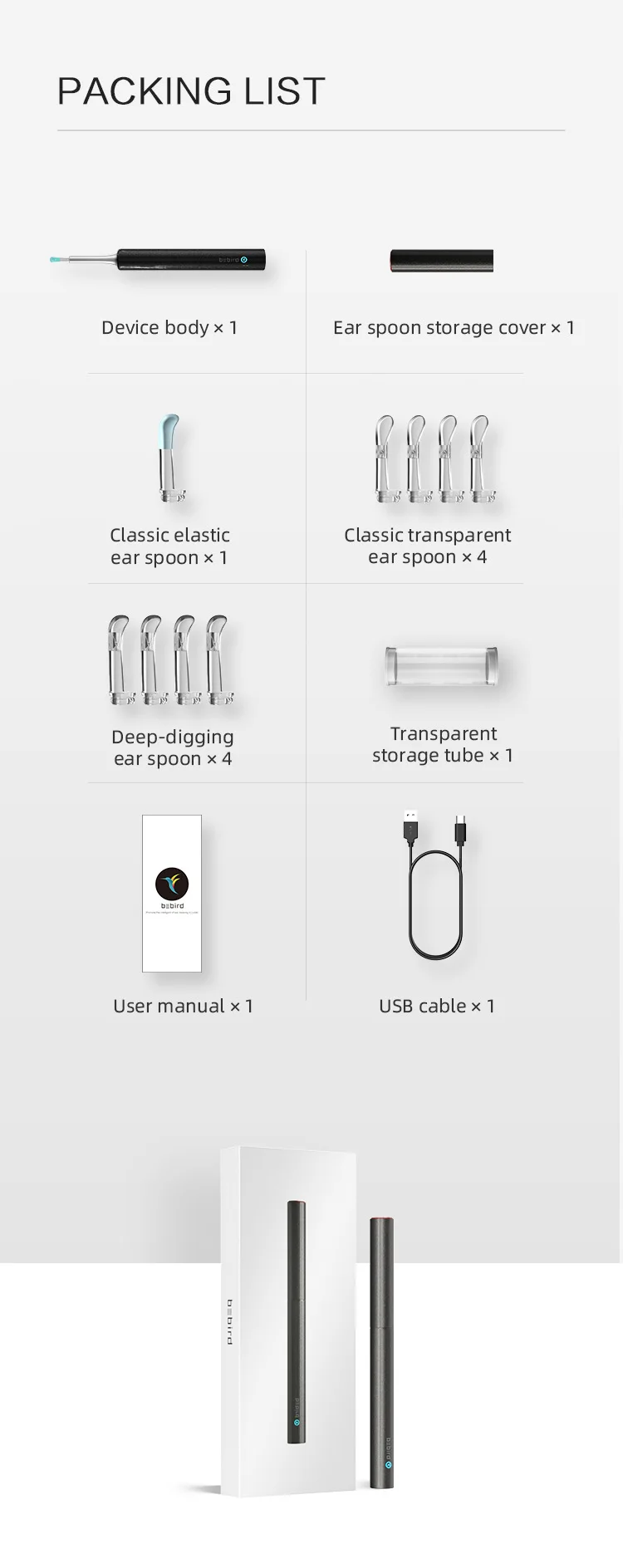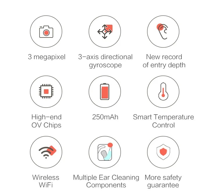 1. 3 мегапикселя эндоскопа высокой четкости реализует визуальный сбор уха, делая сбор уха проще и безопаснее. 2. Трехосевой Интеллектуальный направленный гироскоп делает сбор уха проще, безопаснее и точнее. Неиндуктивная температура близка к температуре человеческого тела и заботится о ваших ушах. 3. high-end Wi-Fi чип может быть быстро и автоматически подключается к смартфону после первого успешного подключения и 3,5 мм внутренний диаметр может быть легко наносятся на небольшой ушному каналу. 5. Научный, эргономичный, оснащен светодиодный подсветкой, нескользящими ручками и более боковой конструкцией. 6. 250 мА/ч, большая емкость, 1,5 H быстрой зарядки может использоваться в течение 80 минут