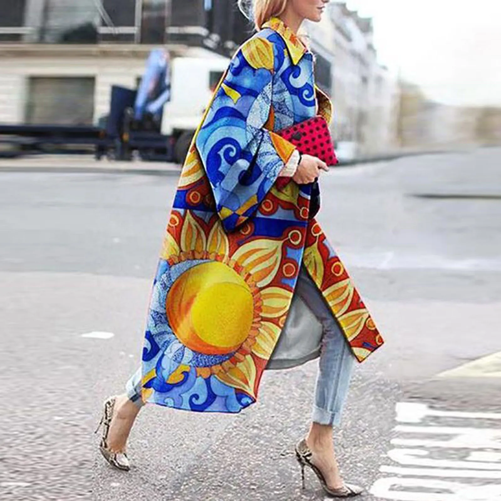 Модная женская куртка с карманами и принтом, верхняя одежда, кардиган, пальто, длинный Тренч
