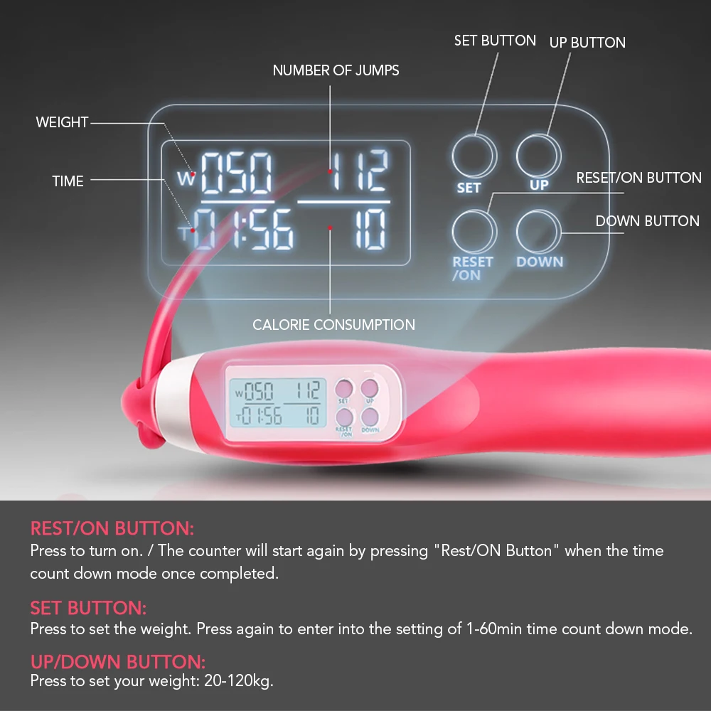 Четырехкнопочный Скакалка с батареей CR2032 внутри, будет отображать время, потребление калорий, Количество Прыжков и вес (на основе вашего веса: 20-120 кг).
