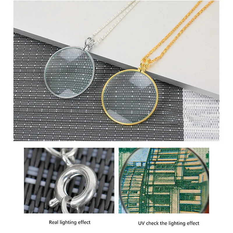 <Материал: изготовлен из стеклянной линзы и цинкового сплава. Колье увеличительное стекло обладает высокой долговечностью.