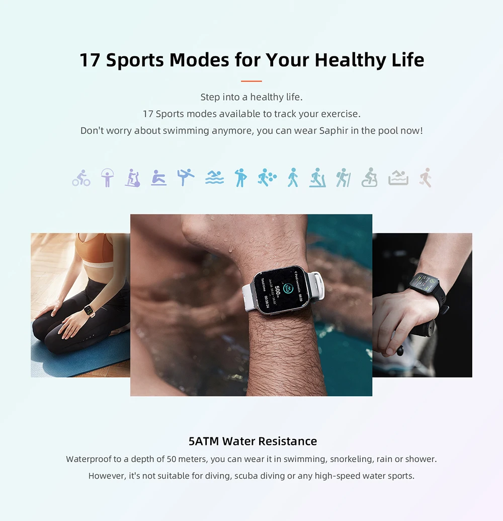 17 спортивных режимов 5 АТМ Водонепроницаемость