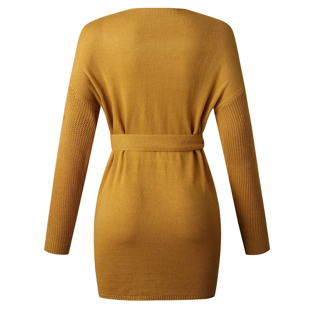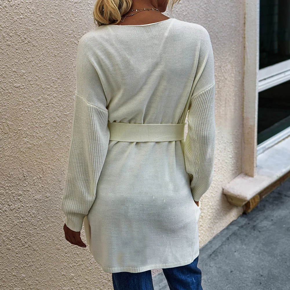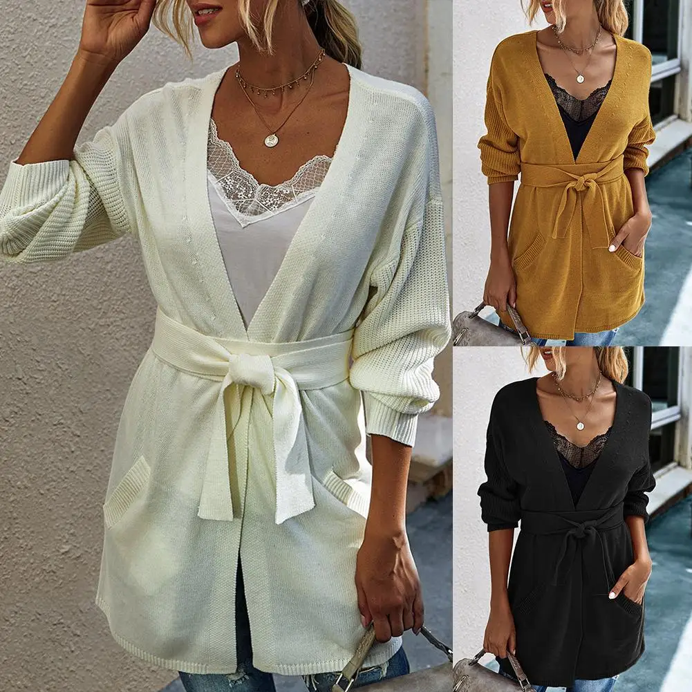 Casual Women Autumn Solid Color Open Front Sweater Cardigan Pockets Belt Coat