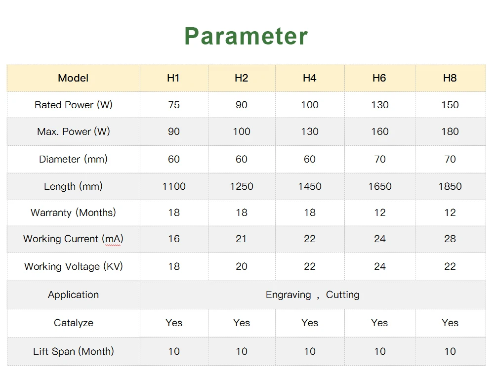 Лазерная трубка серии H имеет зрелую технологию и стабильное и надежное качество. Использование новейших технологий улучшает стабильность структуры продукта и улучшает режим точечного вывода в определенной степени. По сравнению с другими типами продуктов, он имеет характеристики «отличное место, гораздо сходство, легкая установка».