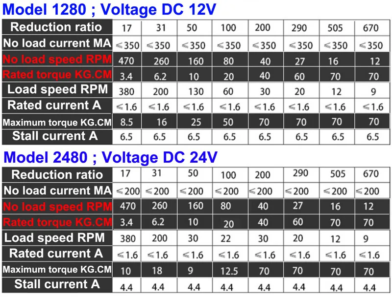 Номинальный крутящий момент от 3,4 до 70 кг. См; Крутящий момент в стойке: от 5 до 70 кг, рекомендуется, чтобы нагрузка на ваш проект не превышала Номинальный крутящий момент, иначе срок службы двигателя будет уменьшен или сгорит двигатель; выберите Скорость без нагрузки в 24 В постоянного тока, будет соответствующий Номинальный крутящий момент и крутящий момент в стойке, См. Таблицу параметров ниже.