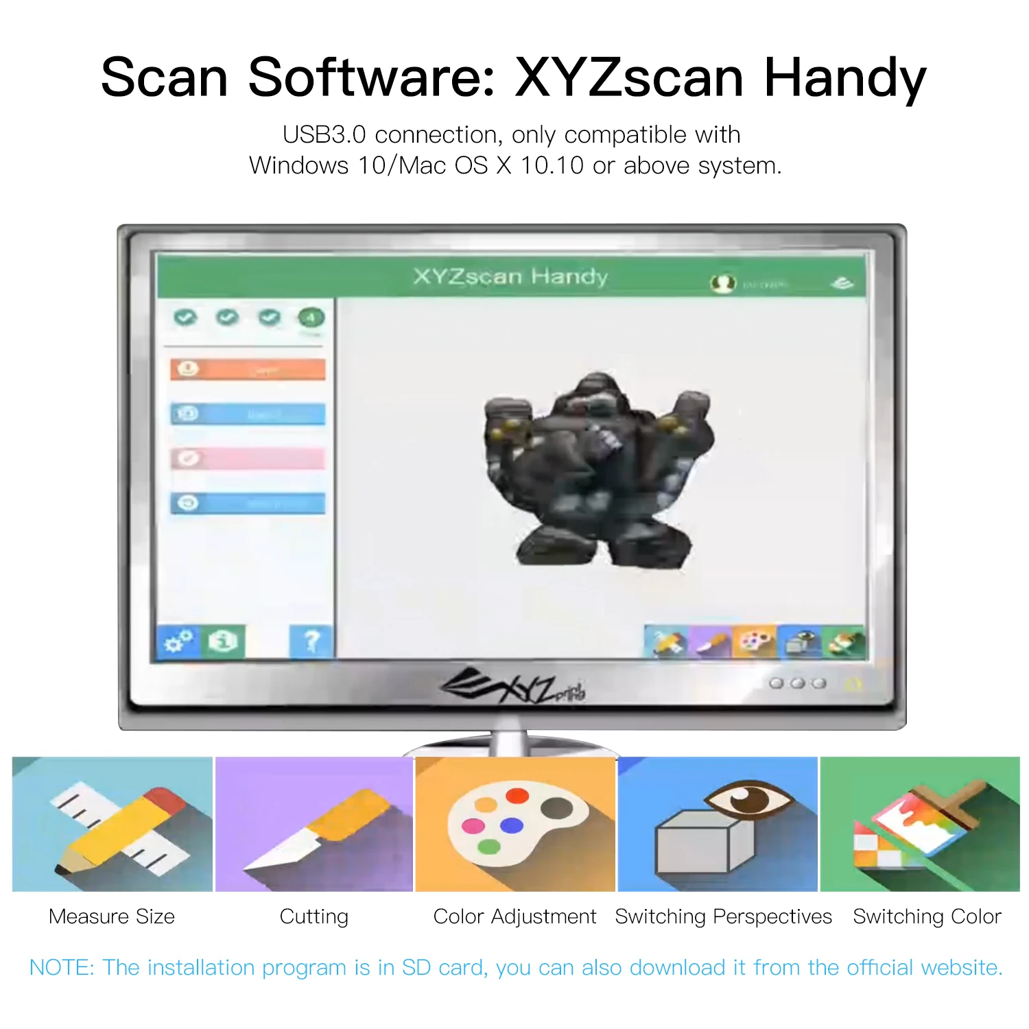 1. XYZscan удобная программа установки находится в sd-карте, вы также можете скачать его с официального сайта://www.xyzprinting.com/en-US/product/3d-scanner-pro