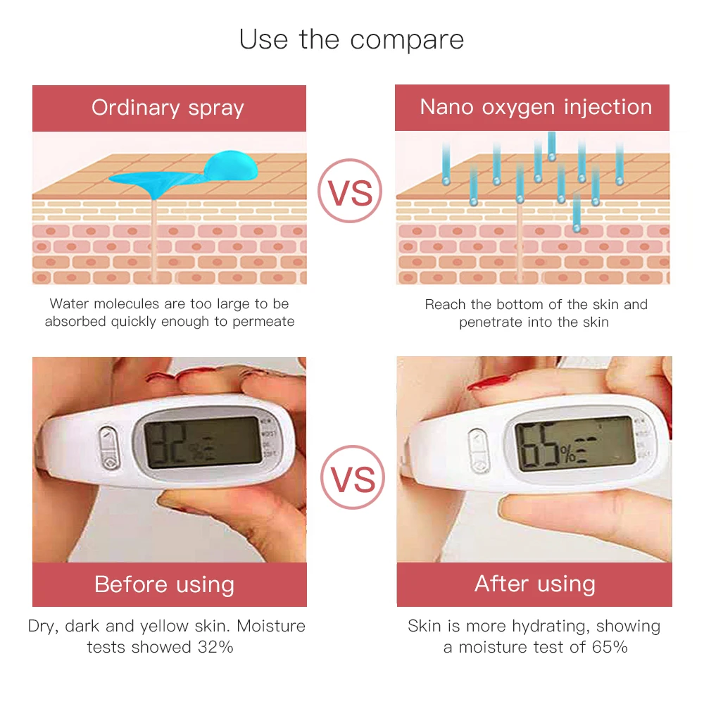1. Кислорода в крови и активные вещества отправляются в 0,03 мм сопло-насадка для того чтобы произвести тонкого распыления и точный спрей, который может легко проникает в кожу нижней части для более эффективному поглощению питательных веществ, помогает сохранить ваши средства по уходу за кожей отходов и этим сэкономим вам распыления времени.