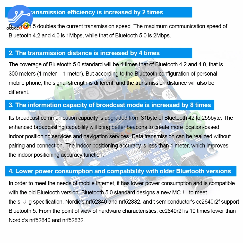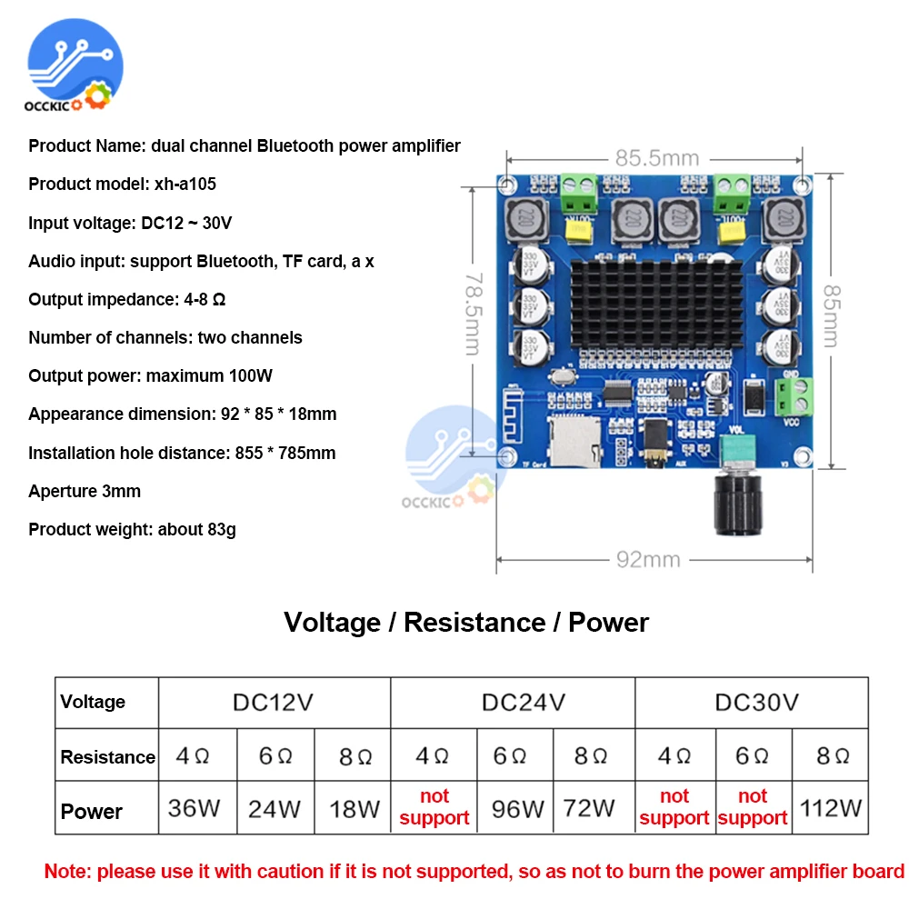 XH-A105 цифровой усилитель мощности доска с высокой точностью и двухканальный стереозвук высокого качества; Входное напряжение DC 12 ~ 24V, аудио вход поддерживает Bluetooth, tf-карта, AUX кабель/USB кабель/3,5 мм аудио AUX аудио вход, может быть непосредственно подключен к мобильный телефон, MP3 и т. Д.; Плата усилителя мощности также поставляется с функцией регулировки громкости, Который вращает потенциометр chirp по часовой стрелке для увеличения и против часовой стрелки для уменьшения.