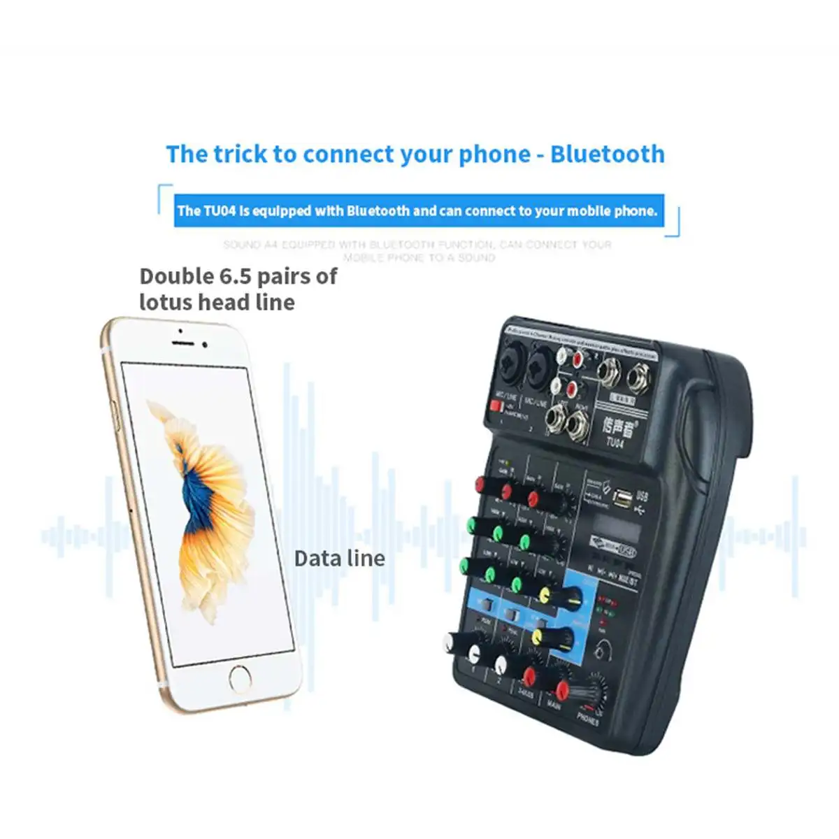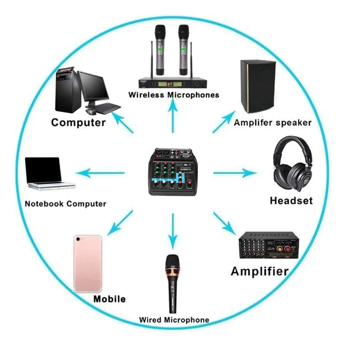 Функция микшерной консоли: (питание, компьютер, зарядное сокровище может быть приведено в действие, с bluetooth USB и функцией звуковой карты)