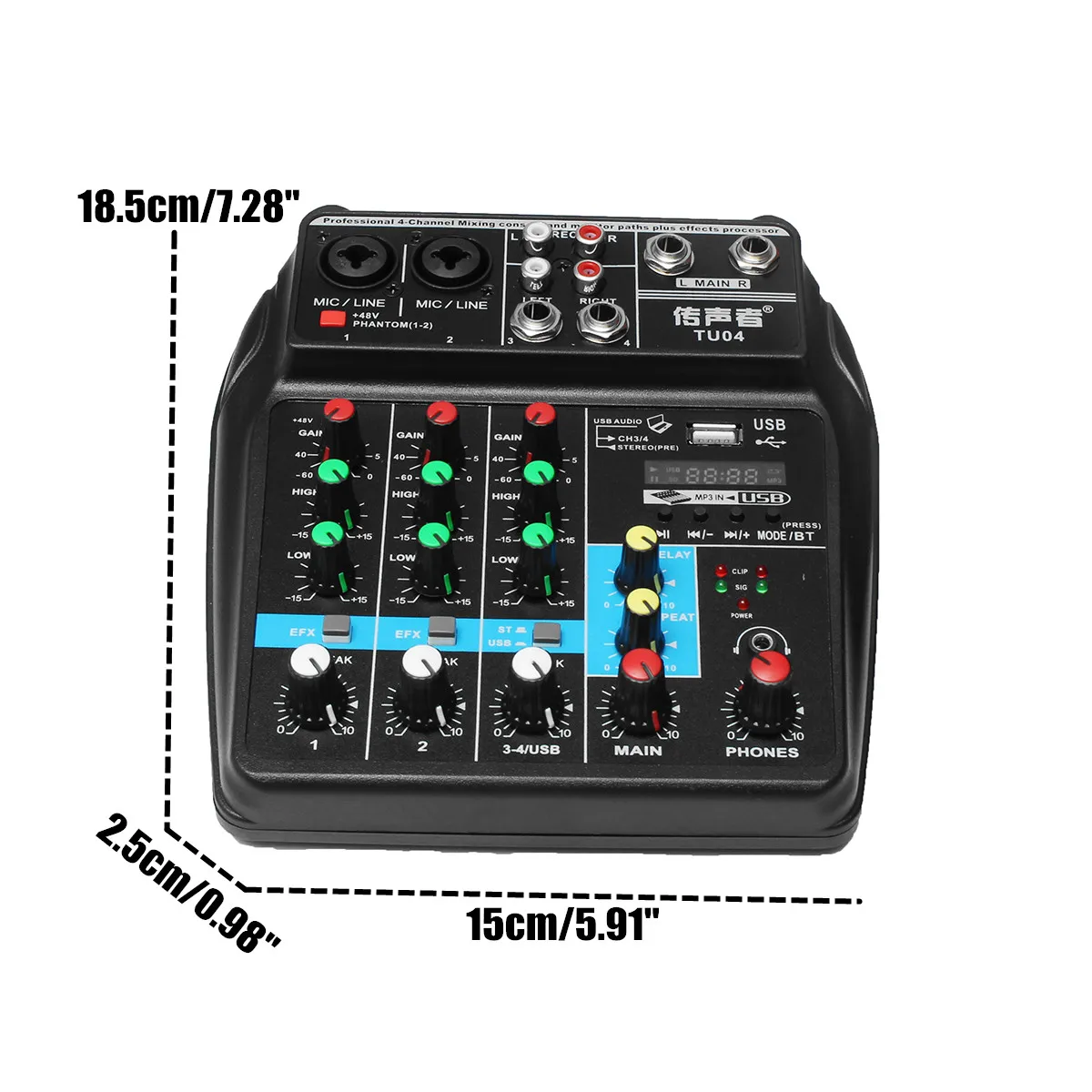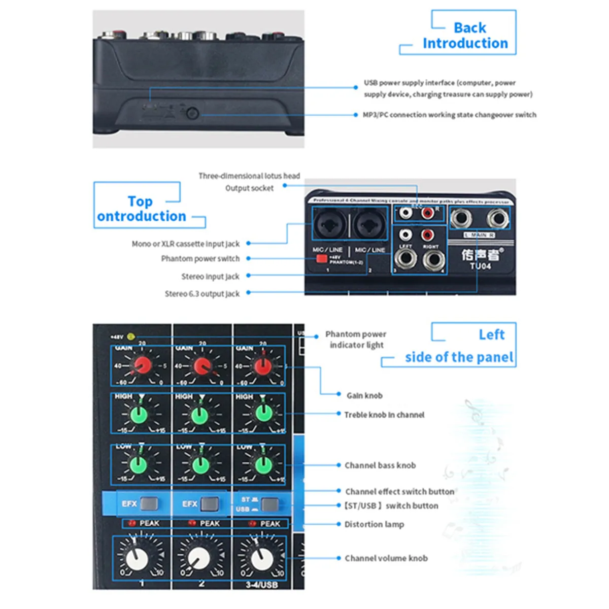 -Смеситель оснащен усиления входного сигнала и высокой регулировки баса, встроенный 48В источника питания для конденсаторный микрофон прямого источника питания, высокой четкости гарнитура выходной порт, MP3 вещания. Устройство со звуковой картой может быть непосредственно подключено к ПК.