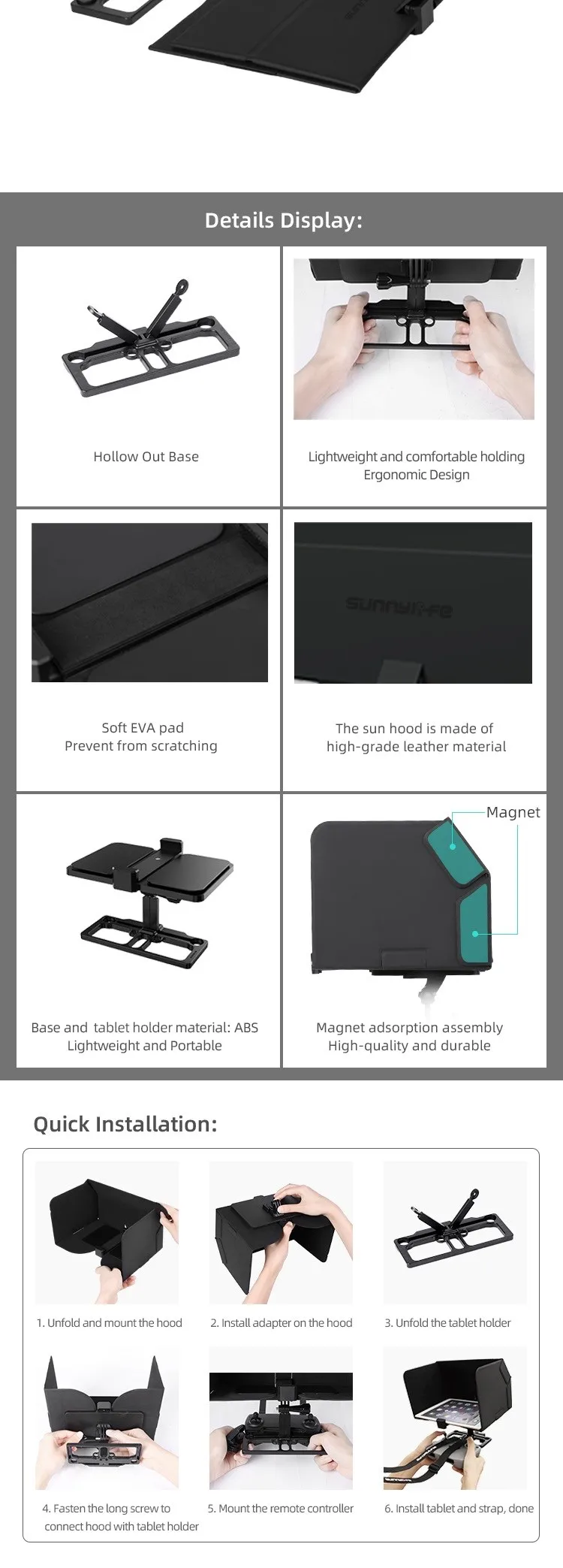 -Большой диапазон зажима около 109-170 мм. Длина солнцезащитного колпака: 247 мм, ширина: 180 мм. Поддерживает большинство планшетов на рынке.