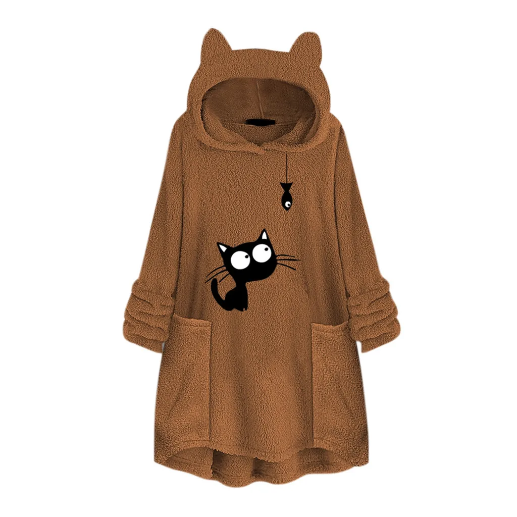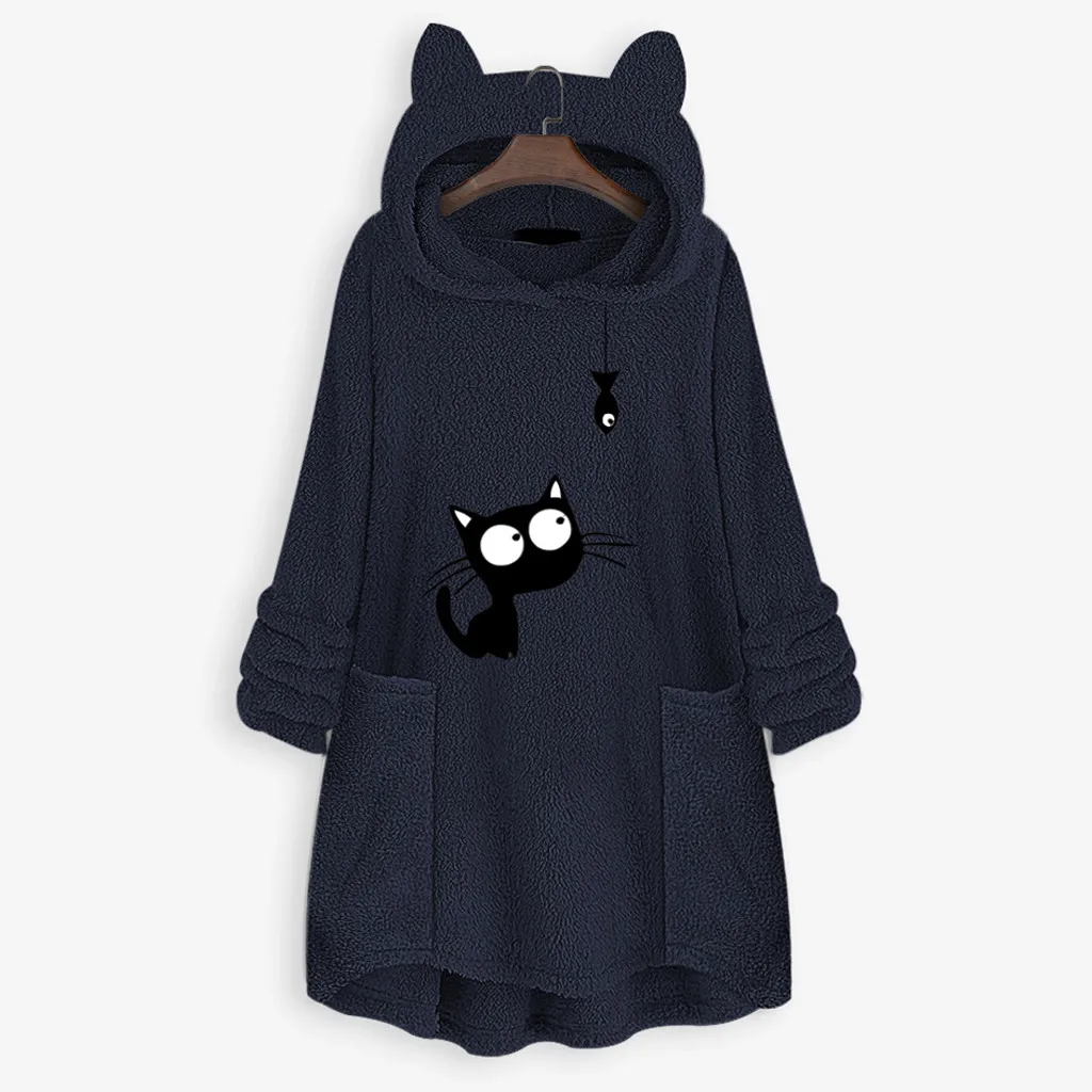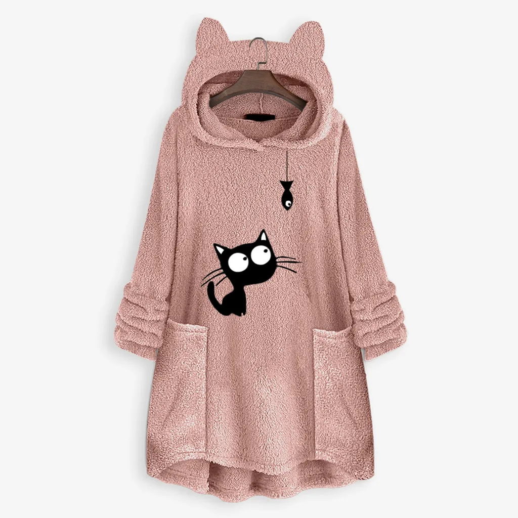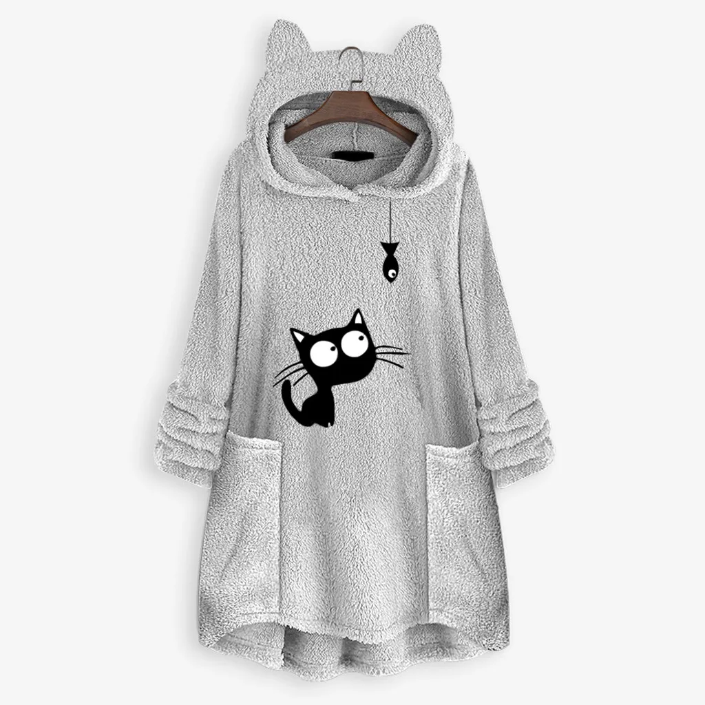 Женский флисовый свитер с вышивкой кошачьими ушками большого размера с капюшоном и карманом