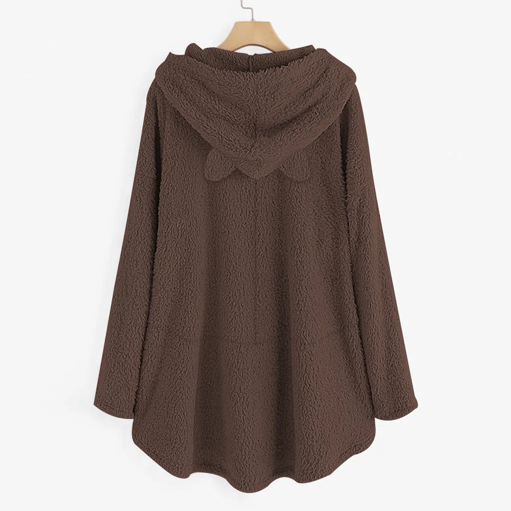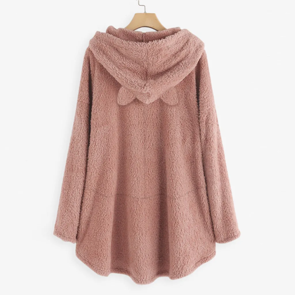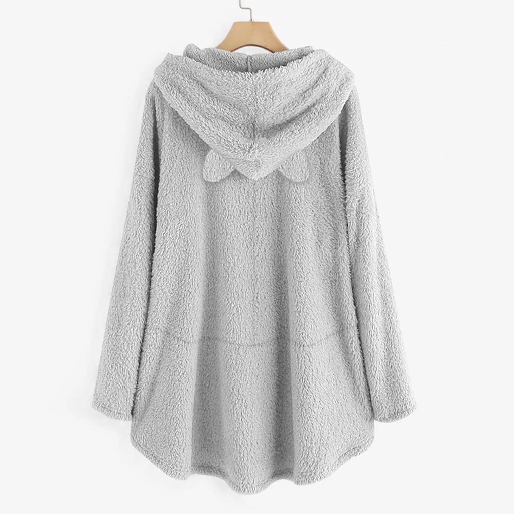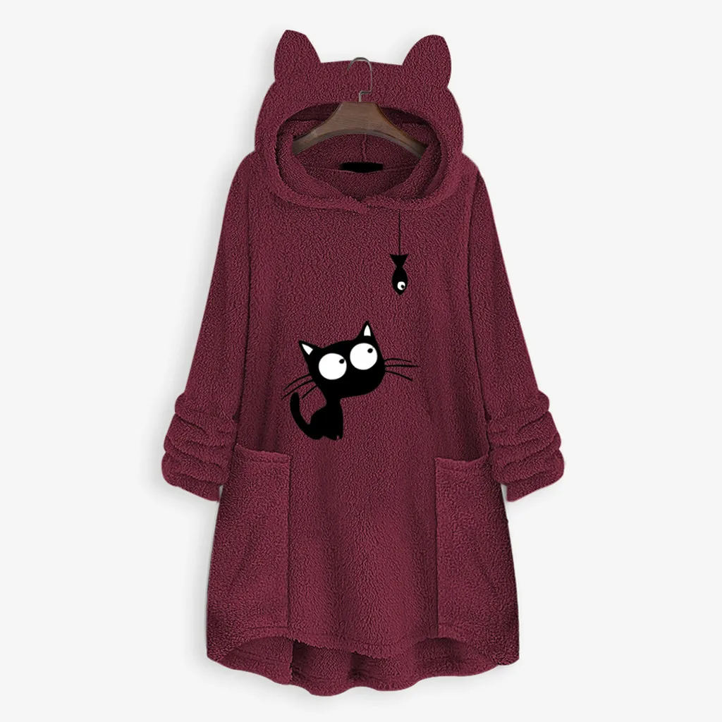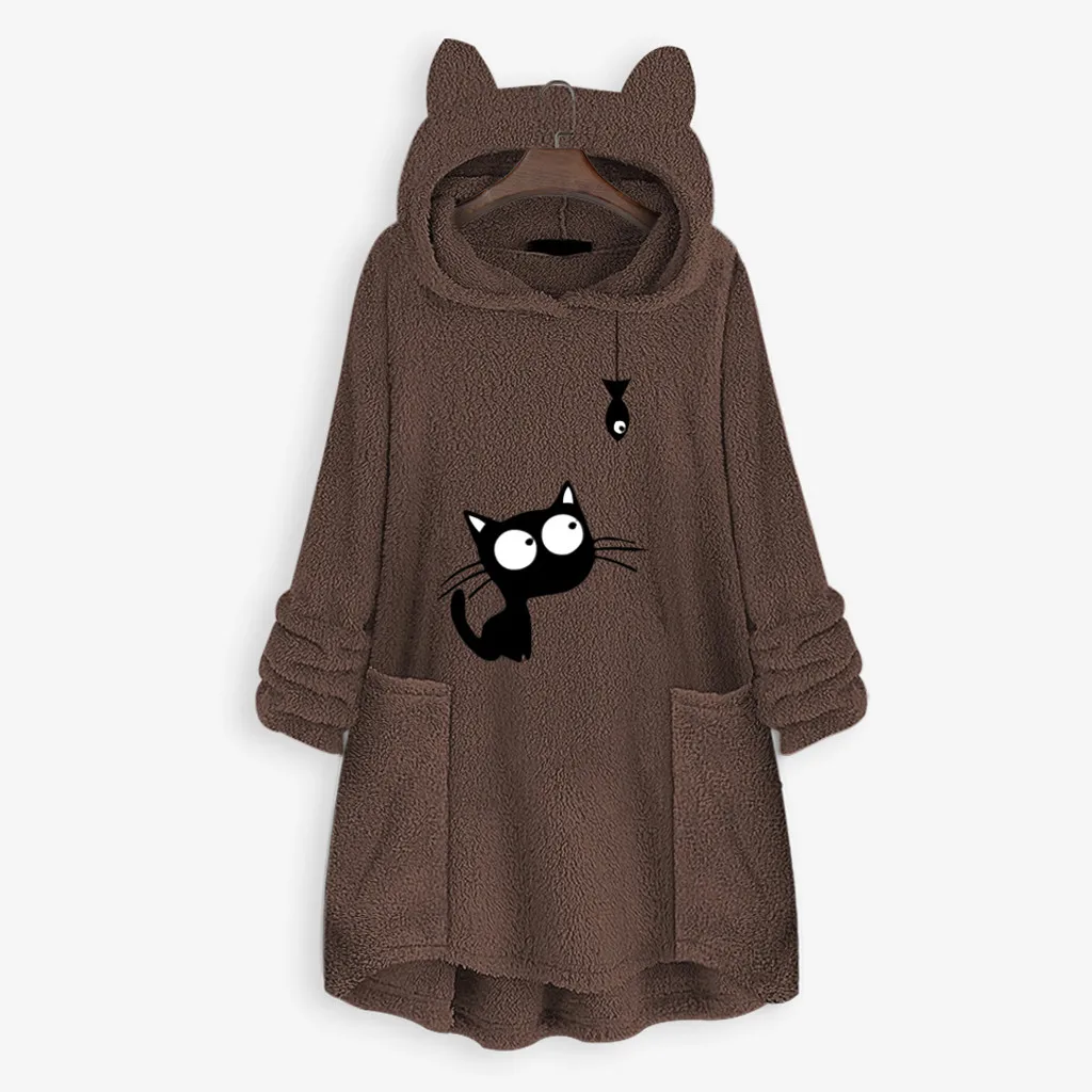 Женский флисовый свитер с вышивкой кошачьими ушками большого размера с капюшоном и карманом