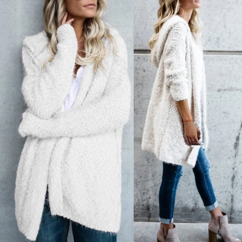 Женский свободный однотонный кардиган с капюшоном и длинным рукавом, открытая спереди трикотажная верхняя одежда