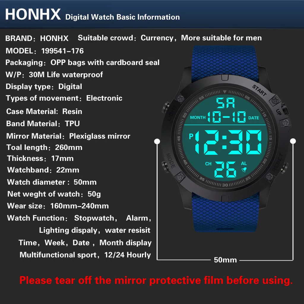 Многофункциональность: отображение времени, секундомер, задний светильник, отображение даты, отображение недели, будильник времени, 12/24 ежечасный, водонепроницаемый, ударопрочный,
