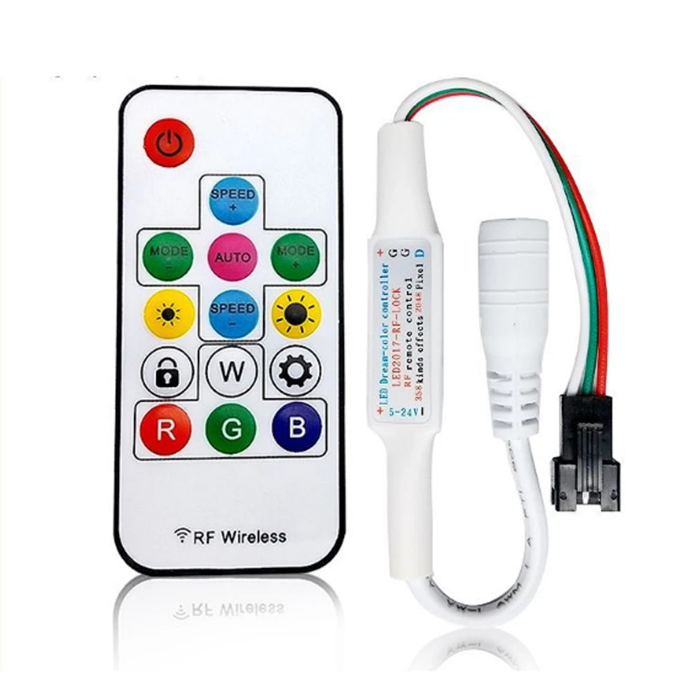 Контроллер DC 17Keys-RF-DIYОсобенности:Радиочастотный пульт дистанционного управления, большое расстояние, мини-размер, подключение провода прост и очень прост в использовании;Поддержка практически всех видов однопроводных или двухпроводных LED-DRIVER-IC ;(можно настроить)С 358 видами узоров, которые являются яркими и красивыми;Каждый контроллер может управлять до 2048 пикселей;С настройкой пользователя функционал сохранения;Регулировка яркости.Предотвращение обратного подключения блока питания.Рабочее напряжение: DC5V-24V(Батарея не входит в комплект) (пульт дистанционного управления не ниже 3 В или не может управлять)