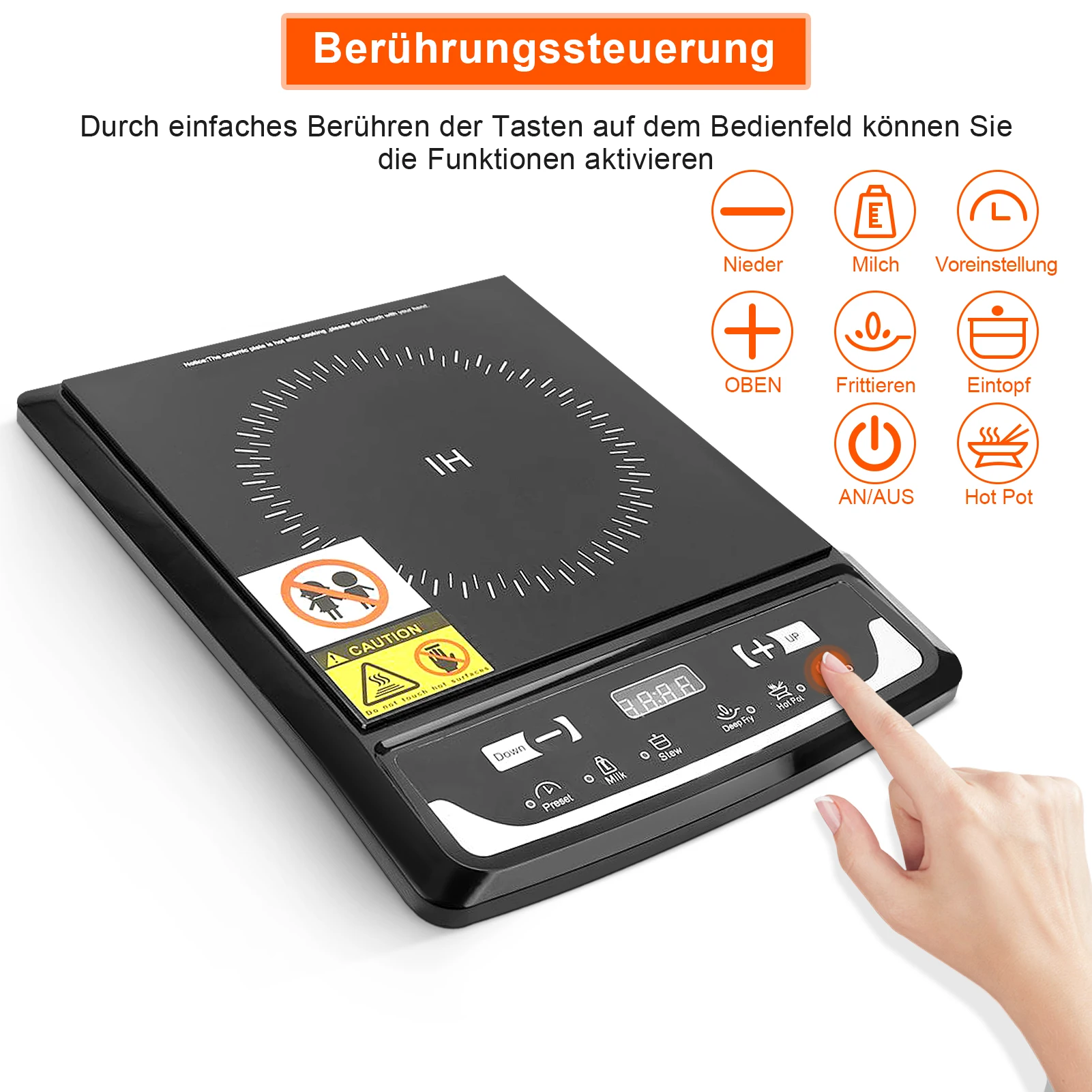 Мощность 2000 Вт для удовлетворения ваших различных потребностей в приготовлении пищи; Тушить, обжарить во фритюре, кипятить, сеять, парить, медленно готовить и с легкостью решать гриль. Подходит для всех видов железных сковородок плита.
