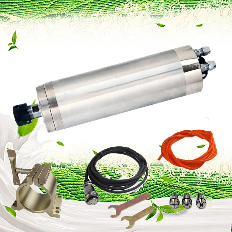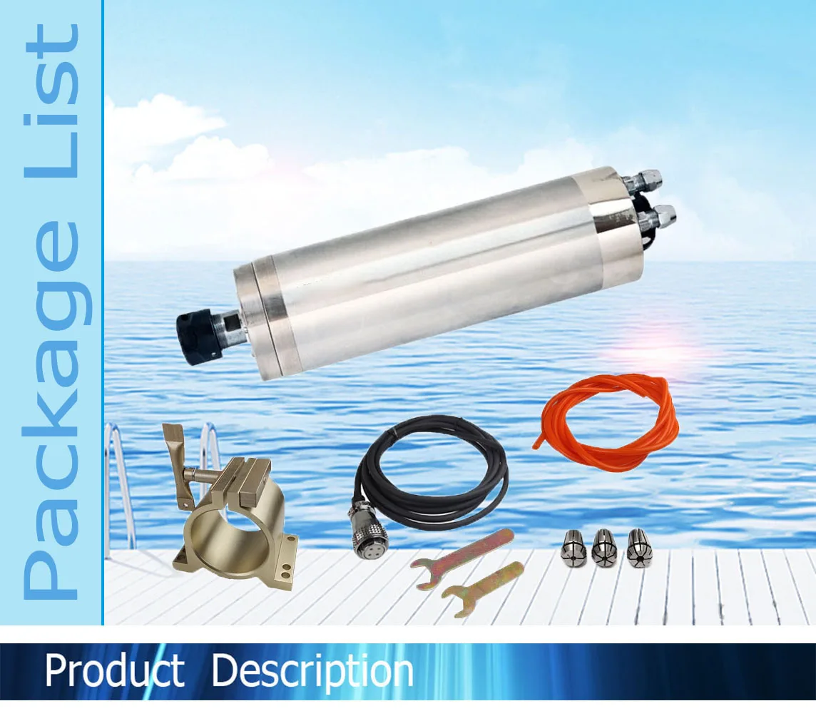 1 X spindle motor with a diameter of 80mm 1 X special aviation plug (with 3m cable welded) 2 X installation wrenches 1 X ER20 simple clamp (chuck + nut) 3 X motor chuck (5mm 7.5mm 10mm) 1 X motor cooling water pipe 10m